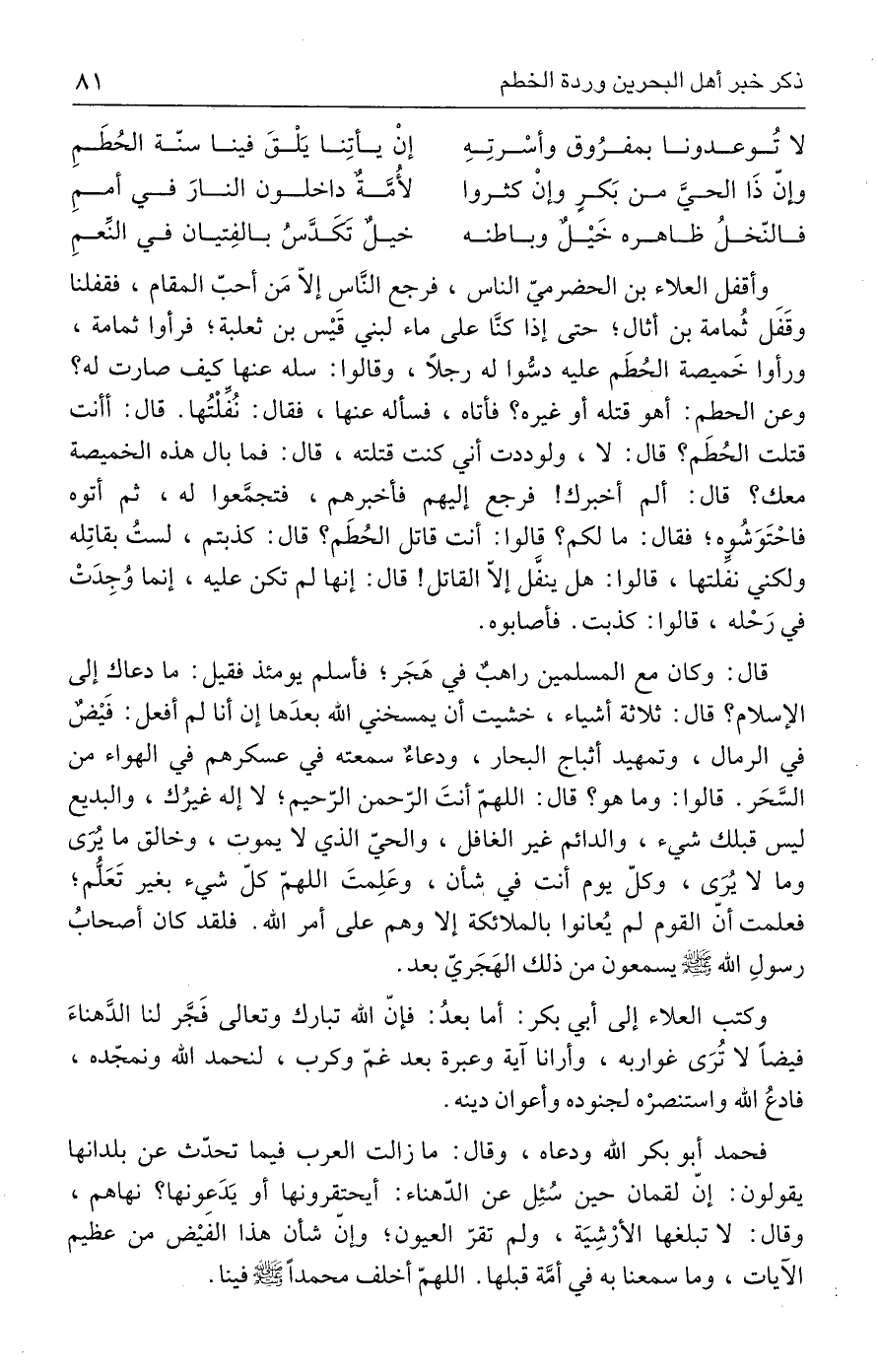 وكتب العلاء إلى أبي بكر: أما بعدُ: فإنّ الله تبارك وتعالى فَجَّر لنا الدَّهناءَ فيضًا لا تُرَى غواربه، وأرانا آية وعبرة بعد غمّ وكرب، لنحمد الله ونمجّده، فادعُ الله واستنصرْه لجنوده وأعوان دينه.
