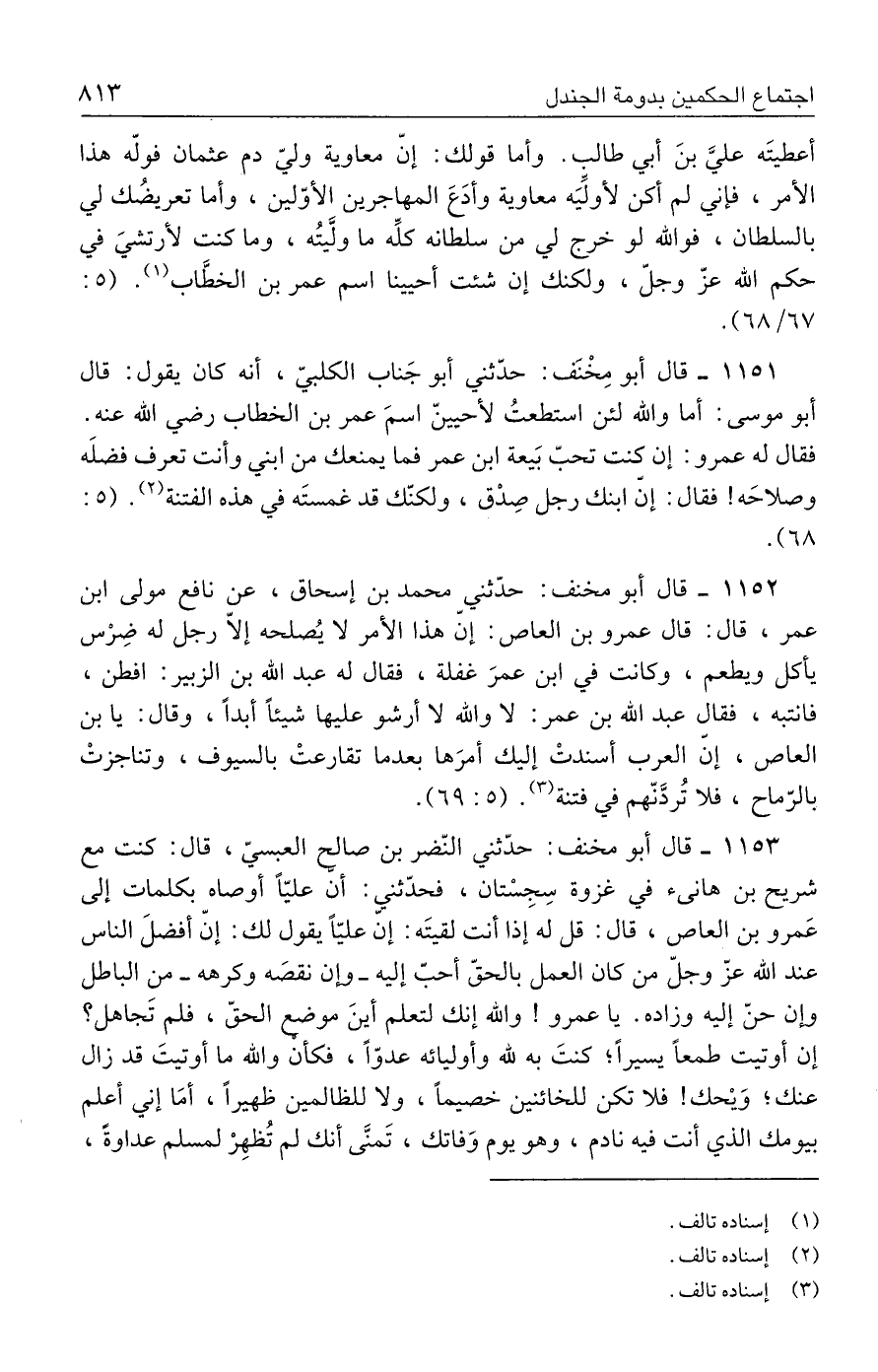 ١١٥١ - قال أبو مِخْنَف: حدّثني أبو جَناب الكلبيّ، أنه كان يقول: قال أبو موسى: أما والله لئن استطعتُ لأحيينّ اسمَ عمر بن الخطاب رضي الله عنه. فقال له عمرو: إن كنت تحبّ بَيعة ابن عمر فما يمنعك من ابني وأنت تعرف فضلَه وصلاحَه! فقال: إنّ ابنك رجل صِدْق، ولكنّك قد غمستَه في هذه الفتنة (٢). (٥: ٦٨).