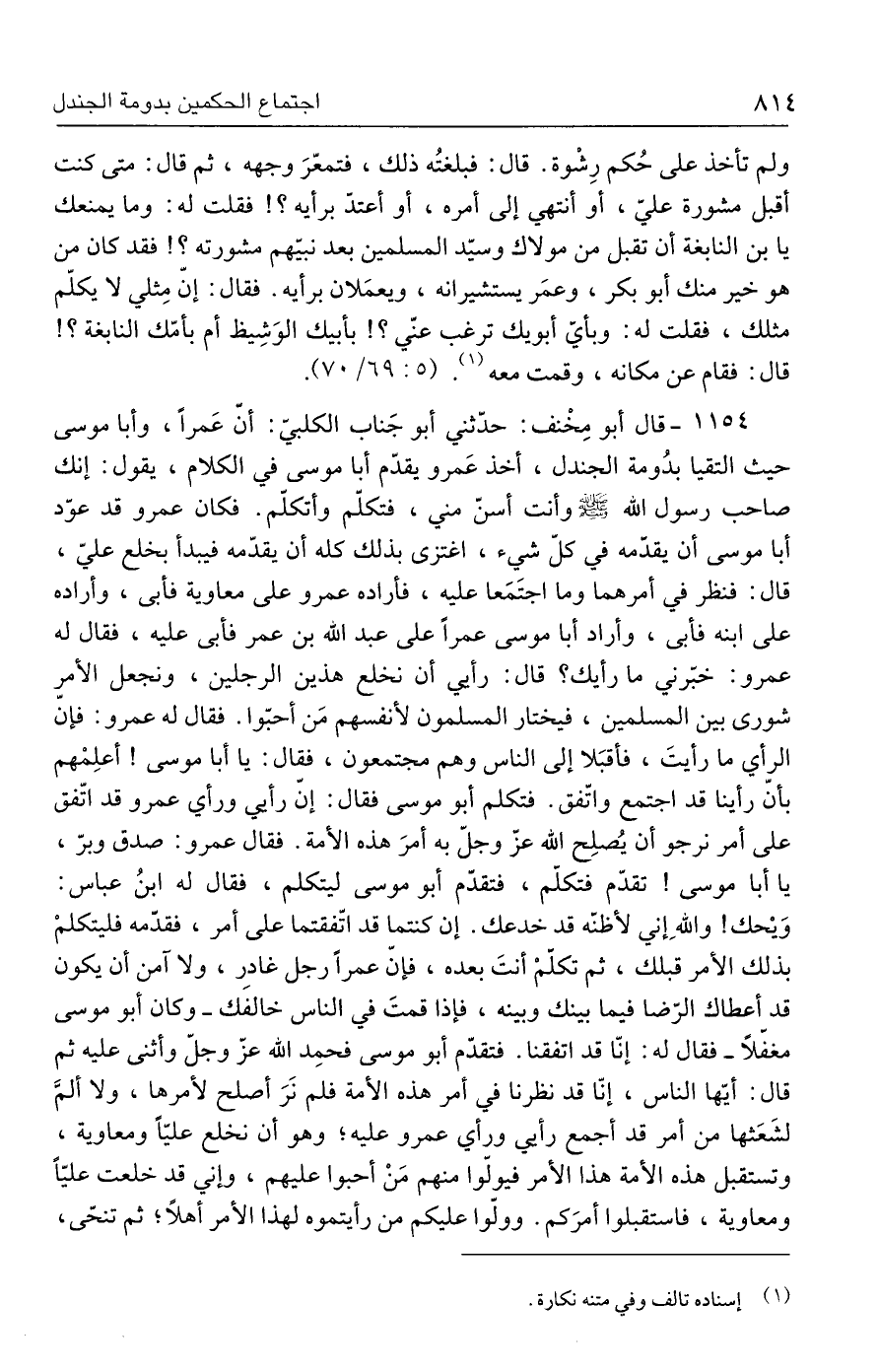 ١١٥٤ - قال أبو مِخْنف: حدّثني أبو جَناب الكلبي: أنّ عَمرًا، وأبا موسى حيث التقيا بدُومة الجندل، أخذ عَمرو يقدّم أبا موسى في الكلام، يقول: إنك صاحب رسول الله - صلى الله عليه وسلم - وأنت أسنّ مني، فتكلّم وأتكلّم. فكان عمرو قد عوّد أبا موسى أن يقدّمه في كلّ شيء، اغتزى بذلك كله أن يقدّمه فيبدأ بخلع عليّ، قال: فنظر في أمرهما وما اجتَمَعا عليه، فأراده عمرو على معاوية فأبى، وأراده على ابنه فأبى، وأراد أبا موسى عمرًا على عبد الله بن عمر فأبى عليه، فقال له عمرو: خبّرني ما رأيك؟ قال: رأي أن نخلع هذين الرجلين، ونجعل الأمر شورى بين المسلمين، فيختار المسلمون لأنفسهم مَن أحبّوا. فقال له عمرو: فإنّ الرأي ما رأيتَ، فأقبَلا إلى الناس وهم مجتمعون، فقال: يا أبا موسى! أعلِمْهم بأنّ رأينا قد اجتمع واتّفق. فتكلم أبو موسى فقال: إنّ رأي ورأي عمرو قد اتّفق على أمر نرجو أن يُصلِح الله عزّ وجلّ به أمرَ هذه الأمة. فقال عمرو: صدق وبرّ، يا أبا موسى! تقدّم فتكلّم، فتقدّم أبو موسى ليتكلم، فقال له ابنُ عباس: وَيْحك! واللهِ إني لأظنه قد خدعك. إن كنتما قد اتفقتما على أمر، فقدّمه فليتكلمْ بذلك الأمر قبلك، ثم تكلّمْ أنتَ بعده، فإنّ عمرًا رجل غادر، ولا آمن أن يكون قد أعطاك الرّضا فيما بينك وبينه، فإذا قمتَ في الناس خالفَك - وكان أبو موسى مغفّلًا - فقال له: إنّا قد اتفقنا. فتقدّم أبو موسى فحمِد الله عزّ وجلّ وأثنى عليه ثم قال: أيّها الناس، إنّا قد نظرنا في أمر هذه الأمة فلم نَرَ أصلح لأمرها، ولا ألمَّ لشَعَثها من أمر قد أجمع رأي ورأي عمرو عليه؛ وهو أن نخلع عليًّا ومعاوية، وتستقبل هذه الأمة هذا الأمر فيوتوا منهم مَنْ أحبوا عليهم، وإني قد خلعت عليًّا ومعاوية، فاستقبلوا أمرَكم. وولّوا عليكم من رأيتموه لهذا الأمر أهلًا؛ ثم تنحّى،
