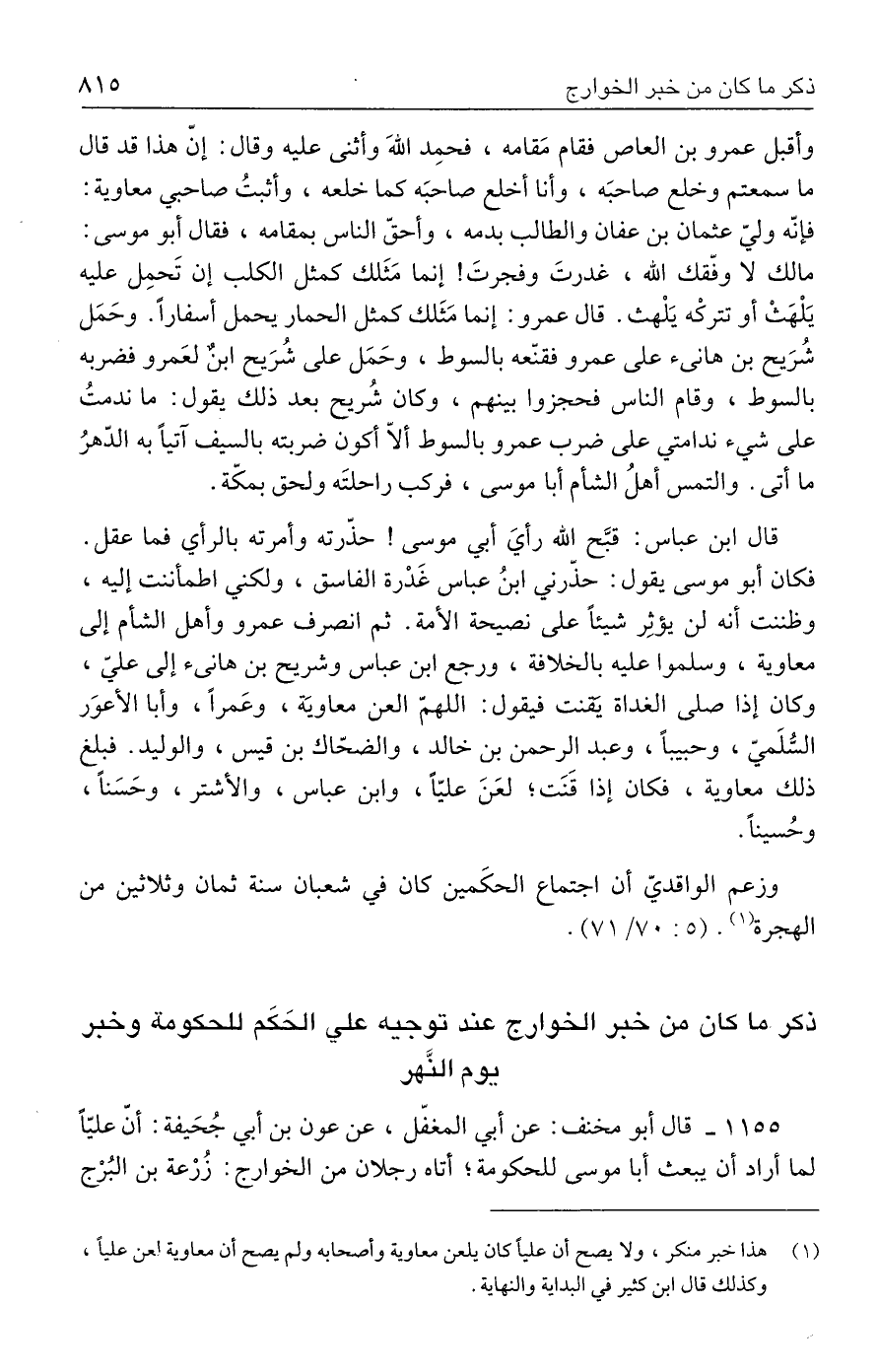 وزعم الواقديّ أن اجتماع الحكَمين كان في شعبان سنة ثمان وثلاثين من الهجرة (١). (٥: ٧٠/ ٧١).