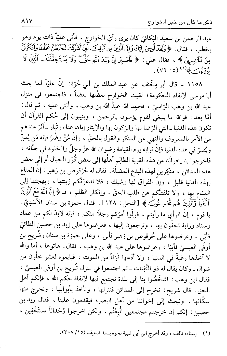 ١١٥٨ - قال أبو مِخْنف عن عبد الملك بن أبي حُرّة: إنّ عليًّا لما بعث أبا موسى لإنفاذ الحكومة؛ لقيت الخوارج بعضُها بعضًا، فاجتمعوا في منزل عبد الله بن وهب الرّاسيّ، فحمِد الله عبدُ الله بن وهب، وأثنى عليه، ثم قال: أمَّا بعد: فوالله ما ينبغي لقوم يؤمنون بالرحمن، وينيبون إلى حُكم القرآن أن تكون هذه الدنيا - التي الرّضا بها والرّكون بها والإيثار إياها عناء وتَبار - آثرَ عندهم من الأمر بالمعروف والنهي عن المنكر والقول بالحقّ، وإنْ مُنَّ وضُرَّ فإنه مَن يُمنّ ويُضرّ في هذه الدنيا فإنّ ثوابه يوم القيامة رضوان الله عزّ وجلّ والخلود في جنّاته، فاخرجوا بنا إخوانَنا من هذه القرية الظالِم أهلُها إلى بعض كُوَر الجبال أو إلى بعض هذه المدائن، منكِرين لهذه البدع المضلّة. فقال له حُرْقوص بن زهير: إنّ المتاع بهذه الدنيا قليل، وإنّ الفراق لها وشيك، فلا تدعوَنّكم زينتها، وبهجتها إلى المقام بها، ولا تلفتنكّم عن طلب الحقّ، وإنكار الظلم، {إِنَّ اللَّهَ مَعَ الَّذِينَ اتَّقَوْا وَالَّذِينَ هُمْ مُحْسِنُونَ}. فقال حمزة بن سنان الأسَدِيّ: يا قوم، إنّ الرأي ما رأيتم، فولّوا أمرَكم رجلًا منكم، فإنه لابدّ لكم من عماد وسناد وراية تحفّون بها، وترجعون إليها، فعرضوها على زيد بن حصين الطائيّ فأبَى، وعرضوها على حُرقوص بن زهير فأبى، وعلى حمزة بن سنان وشُريح بن أوفَى العبسيّ فأبَيَا، وعرضوها على عبد الله بن وهب، فقال: هاتوها، أما والله لا آخذها رغبةً في الدنيا، ولا أدَعها فَرَقًا من الموت، فبايعوه لعشر خلْون من شوال - وكان يقال له ذو الثَّفِنات - ثم اجتمعوا في منزل شُريح بن أوفى العبسيّ، فقال ابن وهب: اشخَصُوا بنا إلى بلدة نجتمع فيها لإنفاذ حكمِ الله، فإنكم أهل الحق. قال شريح: نخرج إلى المدائن فننزلها، ونأخذ بأبوابها، ونخرج منها سكّانها، ونبعث إلى إخواننا من أهل البصرة فيقدمون علينا، فقال زيد بن حصين: إنكم إن خرجتم مجتمعين اتُّبِعْتُم، ولكن اخرجوا وُحْدانًا مستَخْفِين،