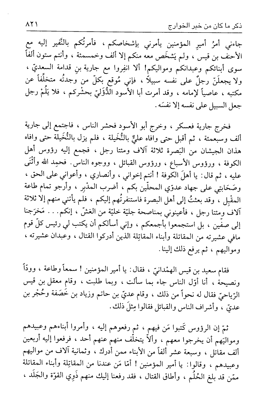 فخرج جارية فعسكر، وخرج أبو الأسود فحشر الناس، فاجتمع إلى جارية ألف وسبعمئة، ثم أقبل حتى وافاه عليٌّ بالنُّخَيلة، فلم يزل بالنُّخَيلة حتى وافاه هذان الجيشان من البَصرة ثلاثة آلاف ومئتا رجل، فجمع إليه رؤوس أهل الكوفة، ورؤوس الأسباع، ورؤوس القبائل، ووجوه الناس. فحمِد الله وأثْنَى عليه، ثم قال: يا أهلَ الكوفة! أنتم إخواني، وأنصاري، وأعواني على الحق، وصَحَابتِي على جهاد عدوّي المحلّين بكم، أضرب المدْبِر، وأرجو تمام طاعة المقْبِل، وقد بعثتُ إلى أهل البصرة فاستنفرتُهم إليكم، فلم يأتني منهم إلا ثلاثة آلاف ومئتا رجل، فأعينوني بمناصحة جليّة خليّة من الغشّ، إنكم ... مَخرَجنا إلى صفين، بل استجمعوا بأجمعكم، وإني أسألكم أن يكتب لي رئيس كلّ قوم ما في عشيرته من المقاتلة وأبناء المقاتِلة الذين أدركوا القتال، وعبدان عشيرته، ومواليهم، ثم يرفع ذلك إلينا.