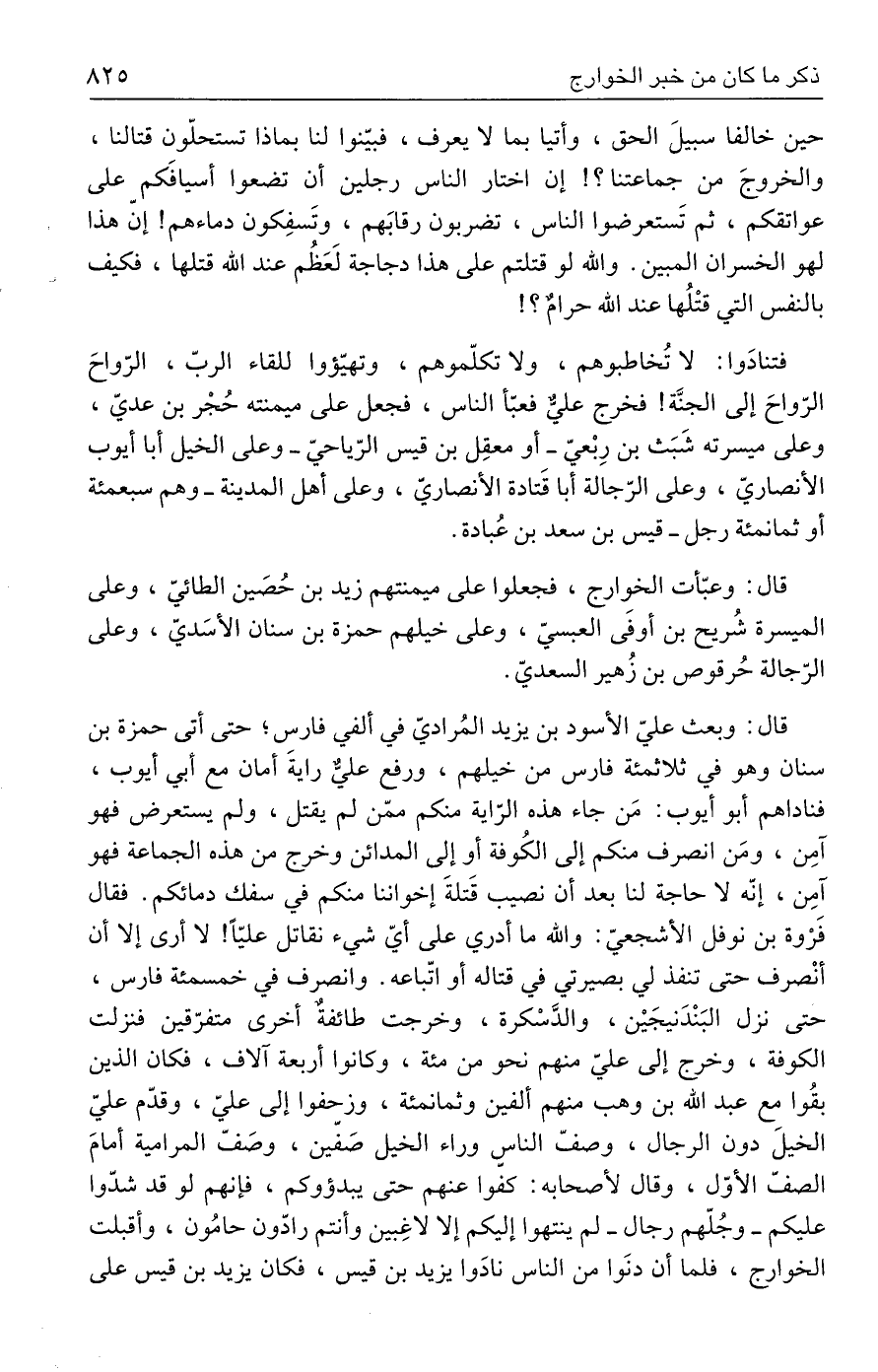 حين خالفا سبيلَ الحق، وأتيا بما لا يعرف، فبيّنوا لنا بماذا تستحلّون قتالنا، والخروجَ من جماعتنا؟ ! إن اختار الناس رجلين أن تضعوا أسيافَكم على عواتقكم، ثم تَستعرضوا الناس، تضربون رقابَهم، وتَسفِكون دماءهم! إنّ هذا لهو الخسران المبين. والله لو قتلتم على هذا دجاجة لَعَظُم عند الله قتلها، فكيف بالنفس التي قتْلُها عند الله حرامٌ؟ !
