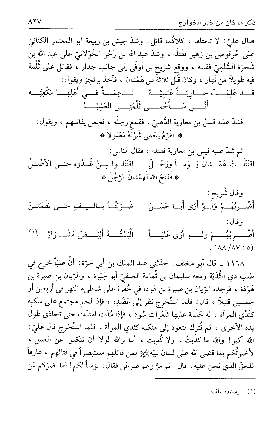 ١١٦٨ - قال أبو مخنف: حدّثني عبد الملك بن أبي حرّة: أنّ عليًّا خرج في طلب ذي الثُّدَيّة ومعه سليمان بن ثُمامة الحنفيّ أبو جَبْرة، والرّيان بن صبرة بن هَوْذة، فوجده الرّيان بن صبرة بن هَوْذة في حُفرة على شاطئ النهر في أربعين أو خمسين قتيلًا، قال: فلما استُخرِج نظر إلى عَضُدِه، فإذا لحم مجتمع على منكبِه كثَدْي المرأة، له حَلَمة عليها شَعَرات سُود، فإذا مُدّت امتدّت حتى تحاذى طول يده الأخرى، ثم تُترك فتعود إلى منكبه كثدي المرأة، فلما استُخرج قال عليّ: الله أكبر! والله ما كذَبتُ، ولا كُذِبت، أما والله لولا أن تنكلوا عن العمل، لأخبرتُكم بما قضى الله على لسان نبيّه - صلى الله عليه وسلم - لمن قاتلهم مستبصرًا في قتالهم، عارفًا للحقّ الذي نحن عليه. قال: ثم مرَّ وهم صرعَى فقال: بؤسًا لكم! لقد ضرّكم مَن