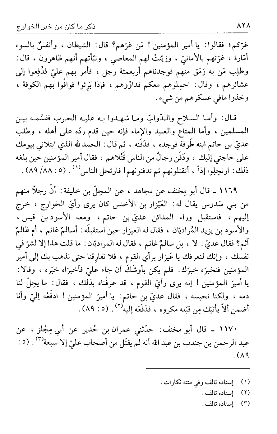 ١١٧٠ - قال أبو مخنف: حدّثني عمران بن حُدير عن أبي مِجْلز، عن عبد الرحمن بن جندب بن عبد الله أنه لم يقتَل من أصحاب عليّ إلا سبعة (٣). (٥: ٨٩).