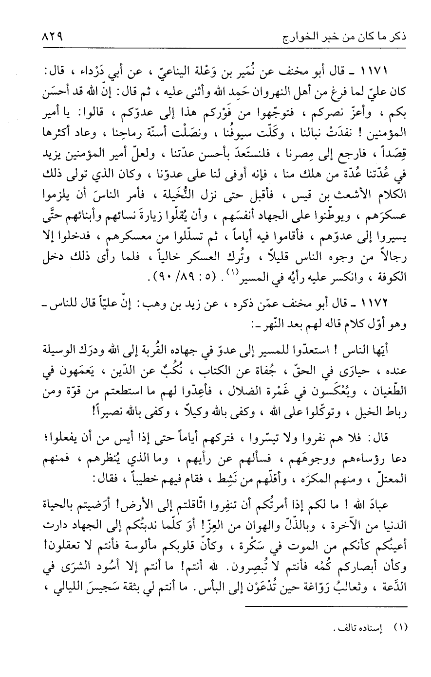 ١١٧٢ - قال أبو مخنف عمّن ذكره، عن زيد بن وهب: إنّ عليًّا قال للناس - وهو أوّل كلام قاله لهم بعد النّهر -: