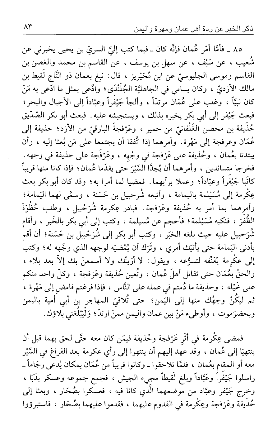 ٨٥ - فأمَّا أمْر عُمان فإنَّه كان - فيما كتب إليَّ السريّ بن يحيى يخبرني عن شُعيب، عن سَيْف، عن سهل بن يوسف، عن القاسم بن محمد والغصن بن القاسم وموسى الجليوسيّ عن ابن مُحَيْريز، قال: نبغ بعمان ذو التَّاج لَقيط بن مالك الأزديّ، وكان يسامي في الجاهليَّة الجُلَنْدَى؛ وادَّعى بمثل ما ادّعى به مَنْ كان نبيًّا ,غلب على عُمَان مرتدًّا، وألجأ جَيْفَرًا وعبّادًا إلى الأجبال والبحر؛ فبعث جَيْفر إلى أبي بكر يخبره بذلك، ويستجيشه عليه. فبعث أبو بكر الصّدّيق حُذَيفة بن محصن الغَلْفانيّ من حمير، وعَرْفجةَ البارقيّ من الأزد؛ حذيفة إلى عُمَان وعرفجة إلى مَهْرة. وأمرهما إذا اتَّفقا أن يجتمعا على مَن بُعثا إليه، وأن يبتدئا بعُمان، وحُذيفة على عَرْفجة في وجْهِه، وعَرْفَجة على حذيفة في وجهه. فخرجا متساندين، وأمرهما أن يُجدَّا السَّيْرَ حتى يقدَما عُمان؛ فإذا كان منها قريبًا كاتَبا جَيْفَرًا وعبّادًا؛ وعملا برأيهما. فمضيا لما أمرا به؛ وقد كان أبو بكر بعث عِكْرمة إلى مُسَيْلمة باليمامة، وأتبعه شُرحبيل بن حَسَنة، وسمَّى لهما اليَمامة؛ وأمرِهما بما أمر به حُذيفة وعَرْفجة. فبادر عِكرمة شُرَحْبيل، وطلب حُظْوَةَ الظَّفرَ، فنكبه مُسَيْلمة؛ فأحجم عن مُسيلمة، وكتب إلى أبي بكر بالخَبر، وأقام شُرَحبيل عليه حيث بلغه الخبَر، وكتب أبو بكر إلى شُرَحْبيل بن حَسَنة؛ أن أقم بأدنى اليَمامة حتى يأتيَك أمري، وتَرَك أن يُمْضيَه لوجهه الذي وجَّهه له؛ وكتب إلى عكْرِمة يُعَنِّفه لتسرُّعه، ويقول: لا أرَينّك ولا أسمعنّ بك إلّا بعد بلاء، والحقْ بعُمَان حتى تقاتل أهلَ عُمان، وتُعين حُذيفة وعَرْفجة، وكلّ واحد منكم على خَيْله، وحذيفة ما دُمتم في عمله على النَّاس، فإذا فرغتم فامضِ إلى مَهْرة، ثم ليكُنْ وجهُك منها إلى اليَمن؛ حتى تُلاقيَ المهاجر بن أبي أمية باليمن وبحضرموت، وأوطئ مَنْ بين عمان واليمن ممنْ ارتدّ؛ وَلْيَبْلُغني بلاؤك.