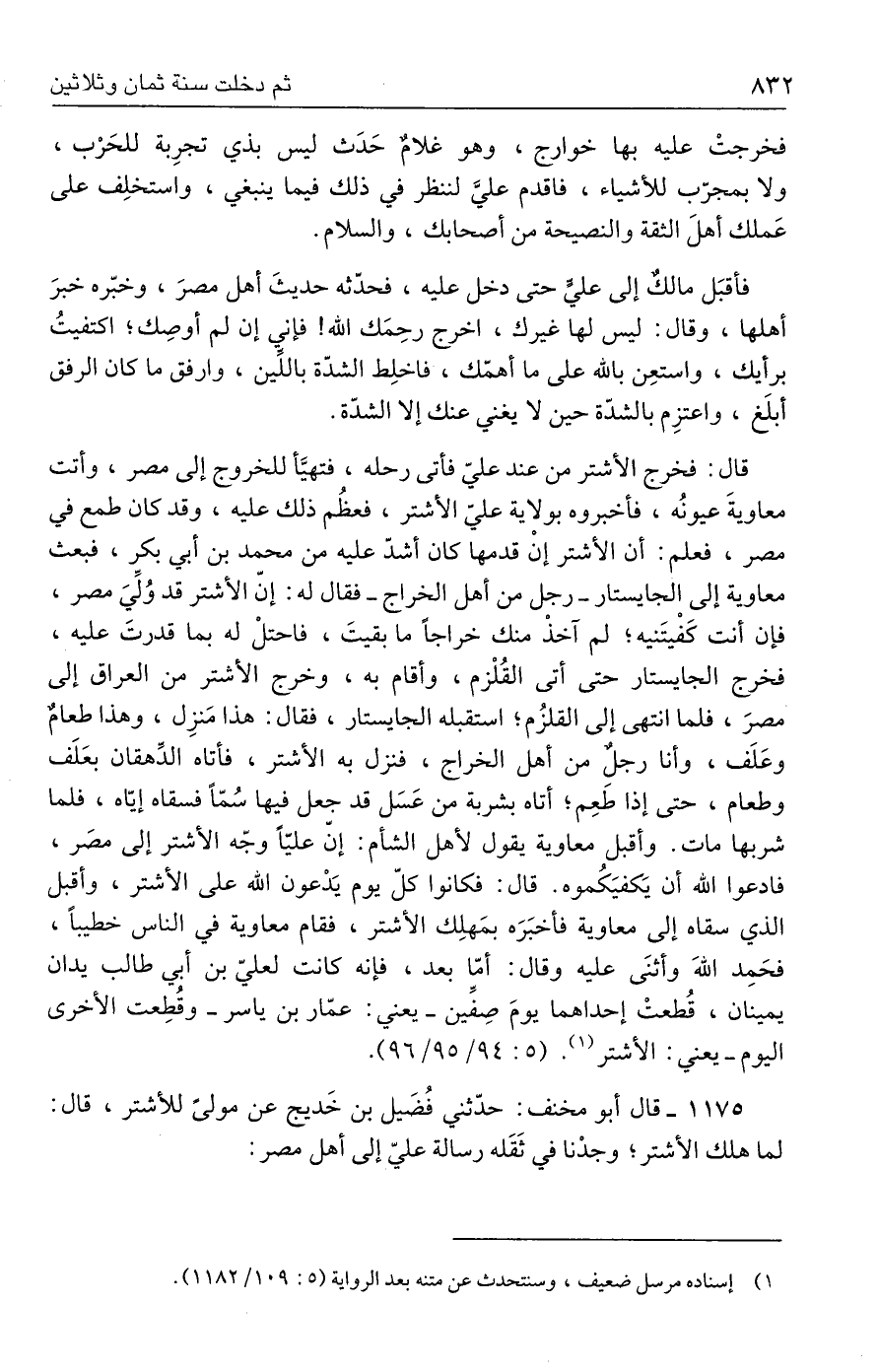 ١١٧٥ - قال أبو مخنف: حدّثني فُضَيل بن خَديج عن مولىً للأشتر، قال: لما هلك الأشتر؛ وجدْنا في ثَقَله رسالة عليّ إلى أهل مصر: