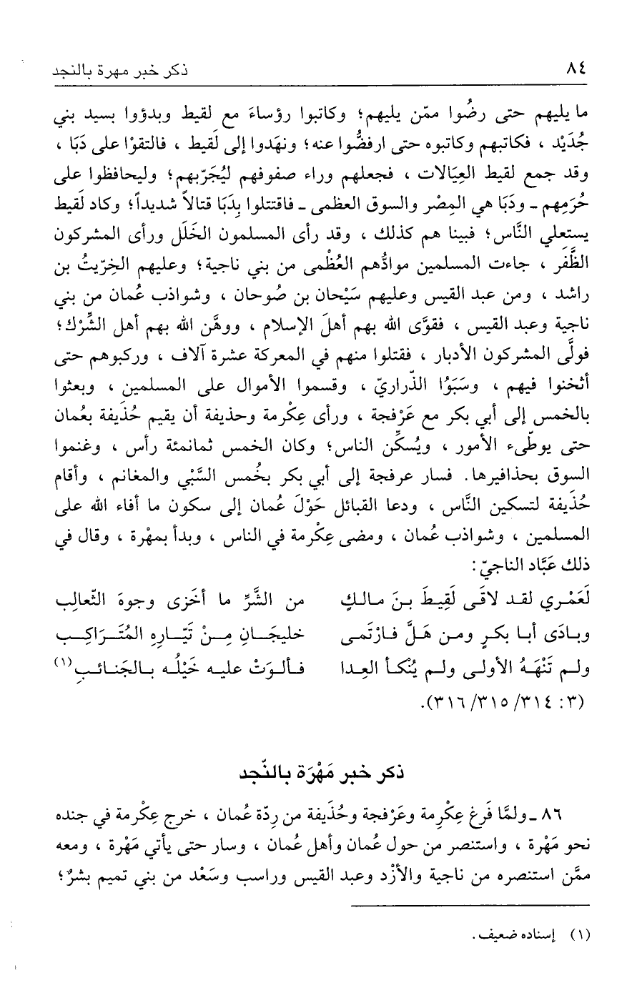 ٨٦ - ولمَّا فَرغ عِكْرِمة وعَرْفجة وحُذَيفة من رِدّة عُمان، خرج عِكْرمة في جنده نحو مَهْرة، واستنصر من حول عُمان وأهل عُمان، وسار حتى يأتي مَهْرة، ومعه ممَّن استنصره من ناجية والأزْد وعبد القيس وراسب وسَعْد من بني تميم بشر؛