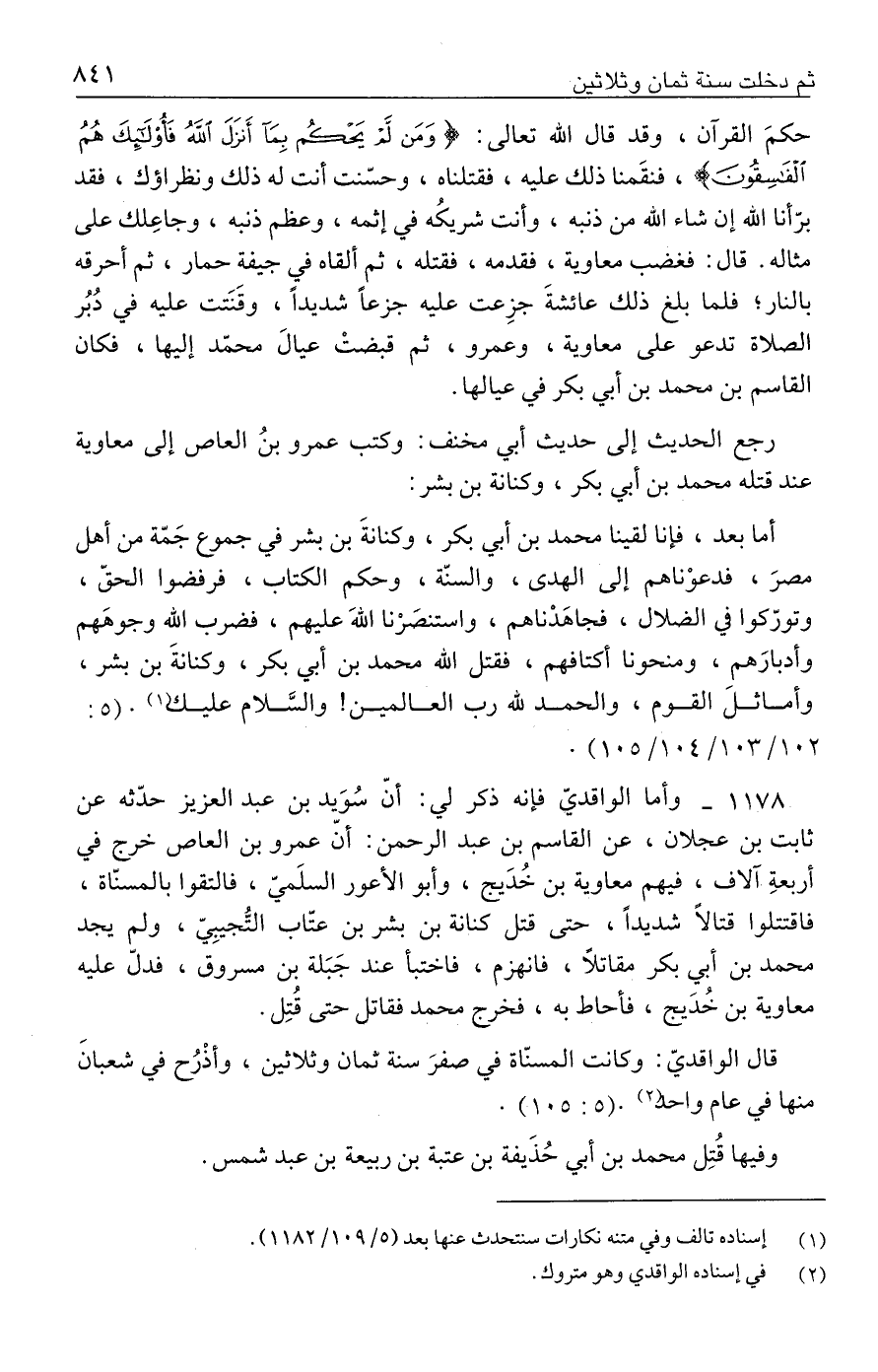 ١١٧٨ - وأما الواقديّ فإنه ذكر لي: أنّ سُوَيد بن عبد العزيز حدّثه عن ثابت بن عجلان، عن القاسم بن عبد الرحمن: أنّ عمرو بن العاص خرج في أربعةِ آلاف، فيهم معاوية بن خُدَيج، وأبو الأعور السلَميّ، فالتقوا بالمسنّاة، فاقتتلوا قتالًا شديدًا، حتى قتل كنانة بن بشر بن عتّاب التُّجيبِيّ، ولم يجد محمد بن أبي بكر مقاتلًا، فانهزم، فاختبأ عند جَبَلة بن مسروق، فدلّ عليه معاوية بن خُدَيج، فأحاط به، فخرج محمد فقاتل حتى قُتِل.