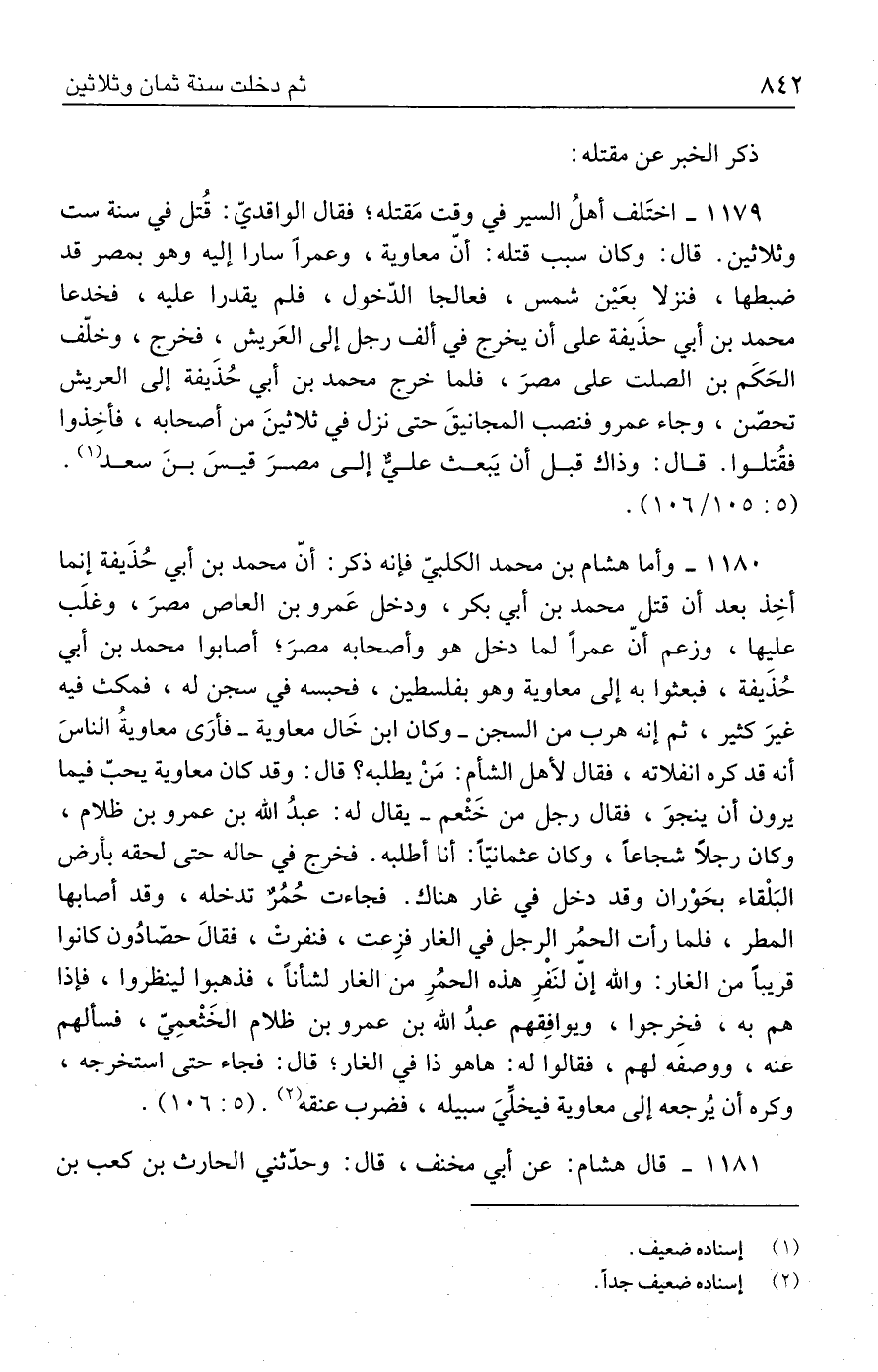 ١١٨٠ - وأما هشام بن محمد الكلبيّ فإنه ذكر: أنّ محمد بن أبي حُذَيفة إنما أخِذ بعد أن قتل محمد بن أبي بكر، ودخل عَمرو بن العاص مصرَ، وغلَب عليها، وزعم أنّ عمرًا لما دخل هو وأصحابه مصرَ؛ أصابوا محمد بن أبي حُذَيفة، فبعثوا به إلى معاوية وهو بفلسطين، فحبسه في سجن له، فمكث فيه غيرَ كثير، ثم إنه هرب من السجن - وكان ابن خَال معاوية - فأرَى معاويةُ الناسَ أنه قد كره انفلاته، فقال لأهل الشأم: مَنْ يطلبه؟ قال: وقد كان معاوية يحبّ فيما يرون أن ينجوَ، فقال رجل من خَثْعم - يقال له: عبدُ الله بن عمرو بن ظلام، وكان رجلًا شجاعًا، وكان عثمانيًّا: أنا أطلبه. فخرج في حاله حتى لحقه بأرض البَلْقاء بحَوْران وقد دخل في غار هناك. فجاءت حُمُرٌ تدخله، وقد أصابها المطر، فلما رأت الحمُر الرجل في الغار فزِعت، فنفرتْ، فقالَ حصّادُون كانوا قريبًا من الغار: والله إنّ لنَفْرِ هذه الحمُرِ من الغار لشأنًا، فذهبوا لينظروا، فإذا هم به، فخِرجوا، ويوافِقهم عبدُ الله بن عمرو بن ظلام الخَثْعمِيّ، فسألهم عنه، ووصفه لهم، فقالوا له: هاهو ذا في الغار؛ قال: فجاء حتى استخرجه، وكره أن يُرجعه إلى معاوية فيخلِّيَ سبيله، فضرب عنقه (٢). (٥: ١٠٦).