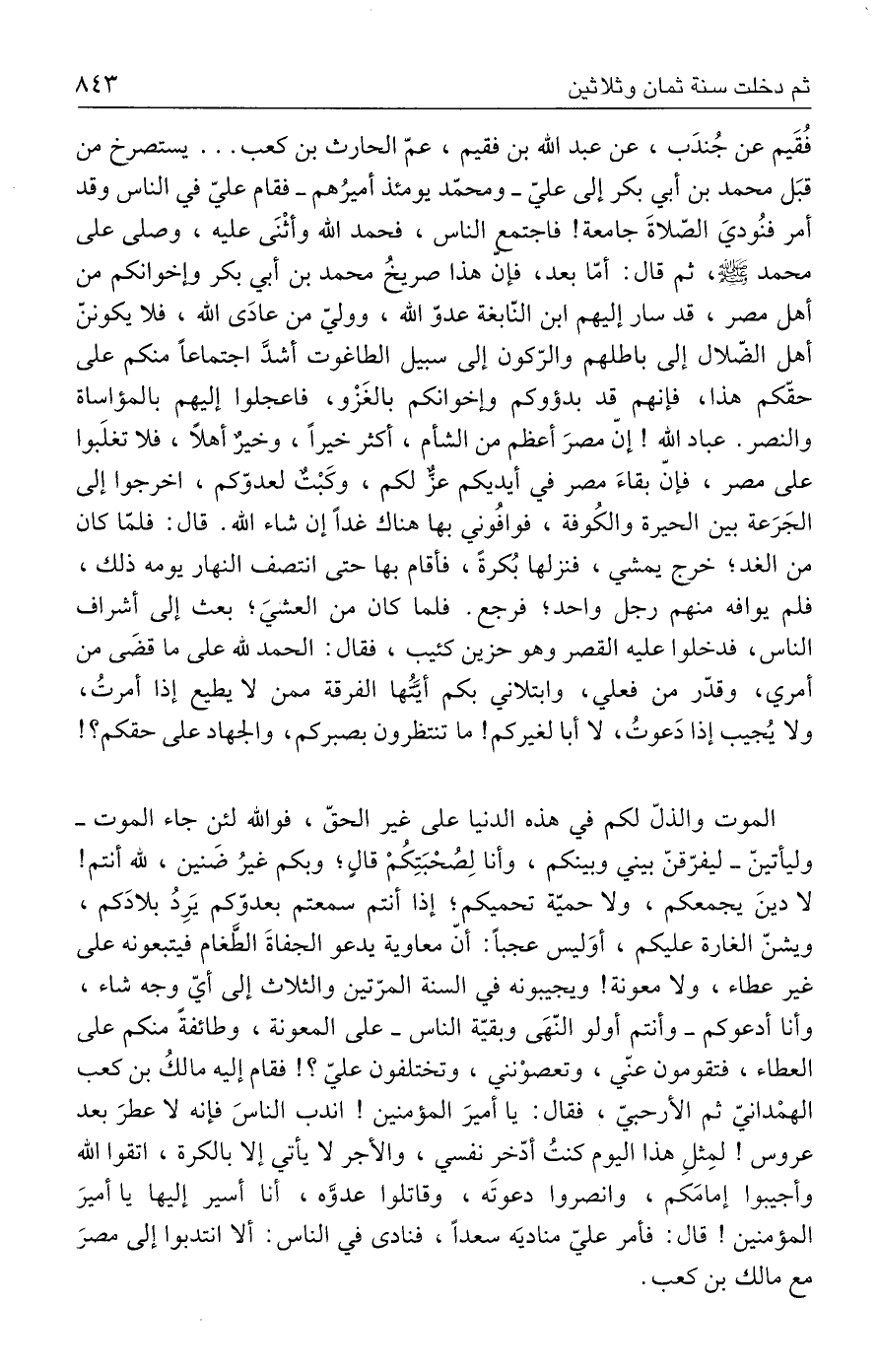 فُقَيم عن جُندَب، عن عبد الله بن فقيم، عمّ الحارث بن كعب ... يستصرخ من قبَل محمد بن أبي بكر إلى عليّ - ومحمّد يومئذ أميرُهم - فقام عليّ في الناس وقد أمر فنُوديَ الصّلاةَ جامعة! فاجتمع الناس، فحمد الله وأثْنَى عليه، وصلى على محمد - صلى الله عليه وسلم -، ثم قال: أمّا بعد، فإن هذا صريخُ محمد بن أبي بكر وإخوانكم من أهل مصر، قد سار إليهم ابن النّابغة عدوّ الله، ووليّ من عادَى الله، فلا يكوننّ أهل الضّلال إلى باطلهم والرّكون إلى سبيل الطاغوت أشدَّ اجتماعًا منكم على حقّكم هذا، فإنهم قد بدؤوكم وإخوانكم بالغَزْو، فاعجلوا إليهم بالمؤاساة والنصر. عباد الله! إنّ مصرَ أعظم من الشأم، أكثر خيرًا، وخيرٌ أهلًا، فلا تغلَبوا على مصر، فإنّ بقاءَ مصر في أيديكم عزٌّ لكم، وكَبْتٌ لعدوّكم، اخرجوا إلى الجَرَعة بين الحيرة والكُوفة، فوافُوني بها هناك غدًا إن شاء الله. قال: فلمّا كان من الغد؛ خرج يمشي، فنزلها بُكرةً، فأقام بها حتى انتصف النهار يومه ذلك، فلم يوافه منهم رجل واحد؛ فرجع. فلما كان من العشيَ؛ بعث إلى أشراف الناس، فدخلوا عليه القصر وهو حزين كئيب، فقال: الحمد لله على ما قضَى من أمري، وقدّر من فعلي، وابتلاني بكم أيَّتُها الفرقة ممن لا يطيع إذا أمرتُ، ولا يُجيب إذا دَعوتُ، لا أبا لغيركم! ما تنتظرون بصبركم، والجهاد على حقكم؟ !