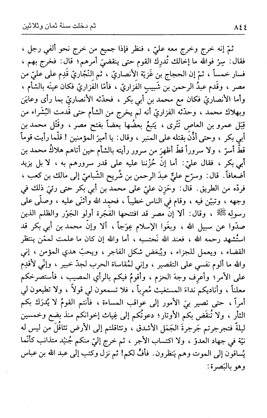 ثمّ إنه خرج وخرج معه علي، فنظر فإذا جميع من خرج نحو ألفي رجل، فقال: سِرْ فوالله ما إخالك تُدرِك القوم حتى ينقضيَ أمرهم؛ قال: فخرج بهم، فسار خمسًا، ثمّ إن الحجاج بن غَزيّة الأنصاريّ، ثم النّجّاريّ قَدِم على عليّ من مصر، وقَدم عبدُ الرحمن بن شَبيبٍ الفَزاريّ، فأمّا الفَزاريّ فكان عينَه بالشأم، وأما الأنصاريّ فكان مع محمد بن أبي بكر، فحدّثه الأنصاريّ بما رأى وعايَن وبهلاك محمد، وحدّثه الفزاريّ أنه لم يخرج من الشام حتى قَدمت البُشَراء من قِبَل عمرو بن العاصِ تَتْرى، يمبعُ بعضُها بعضًا بفتح مصر، وقَتْل محمد بن أبي بكر، وحتى أذِّن بقتله على المنبر، وقال: يا أميرَ المؤمنين! قلّما رأيت قومًا قطّ أسرّ، ولا سرورأ قطّ أظهرَ من سرور رأيته بالشام حين أتاهم هلاكُ محمد بن أبي بكر، فقال عليّ: أما إن حُزْننا عليه على قدر سرورهم به، لا بل يزيد أضعافًا. قال: وسرّح عليّ عبدَ الرحمن بن شُريح الشّباميّ إلى مالك بن كعب، فردّه من الطريق. قال: وحَزِن عليّ على محمد بن أبي بكر حتى رئيَ ذلك في وجهه، وتبيّن فيه، وقام في الناس خطيبًا، فحمِد الله وأثنَى عليه، وصلَّى على رسوله - صلى الله عليه وسلم -، وقال: ألا إن مصر قد افتتحها الفَجَرة أولو الجَوْر والظلم الذين صدّوا عن سبيل الله، وبغَوا الإسلام عِوَجًا، ألا وإنّ محمد بن أبي بكر قد استُشهد رحمه الله، فعند الله نَحتسبه، أما والله إن كان ما علمت لممّن ينتظر القضاء، ويعمل للجزاء، ويُبغض شكل الفاجر، ويحبّ هدي المؤمن، إني والله ما ألوم نفسي على التقصير، وإني لمُقاساة الحرب لجدّ خبير، وإنّي لأقدِم على الأمر؛ وأعرِف وجهَ الحزم، وأقومُ فيكم بالرأي المصيب، فأستصرخكم معلنًا، وأناديكم نداءَ المستغيث مُعرِبًا، فلا تسمعون لي قولًا، ولا تطيعون لي أمرًا، حتى تصير بيَ الأمور إلى عواقب المساءة، فأنتم القومُ لا يُدرَك بكم الثار، ولا تُنقَض بكم الأوتار؛ دعوتُكم إلى غِياث إخوانكم منذ بضع وخمسين ليلةً فتجرجرتم جَرجرةَ الجَمَل الأشدق، وتثاقلتم إلى الأرض تثاقُلَ من ليس له نيّة في جهاد العدوّ، ولا اكتساب الأجر، ثم خرج إليّ منكم جُنيْد متذانب كأنّما يُساقون إلى الموت وهم يَنظرون. فأفٍّ لكم! ثم نزل وكتب إلى عبد الله بن عباس وهو بالبَصرة: