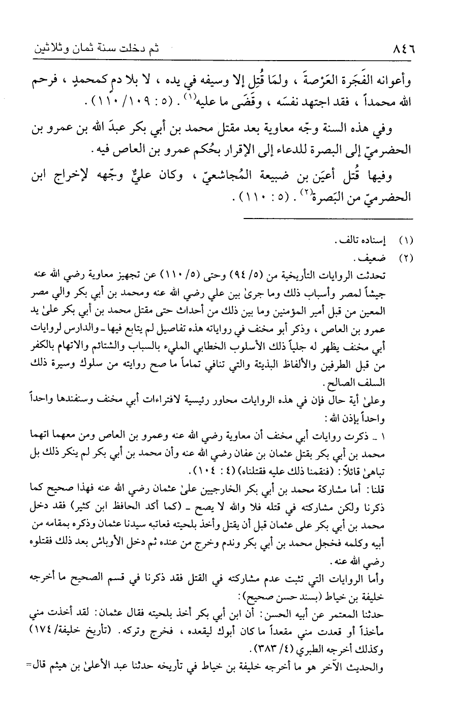 ١ - ذكرت روايات أبي مخنف أن معاوية رضي الله عنه وعمرو بن العاص ومن معهما اتهما محمد بن أبي بكر بقتل عثمان بن عفان رضي الله عنه وأن محمد بن أبي بكر لم ينكر ذلك بل تباهى قائلًا: (فنقمنا ذلك عليه فقتلناه) (٤: ١٠٤).