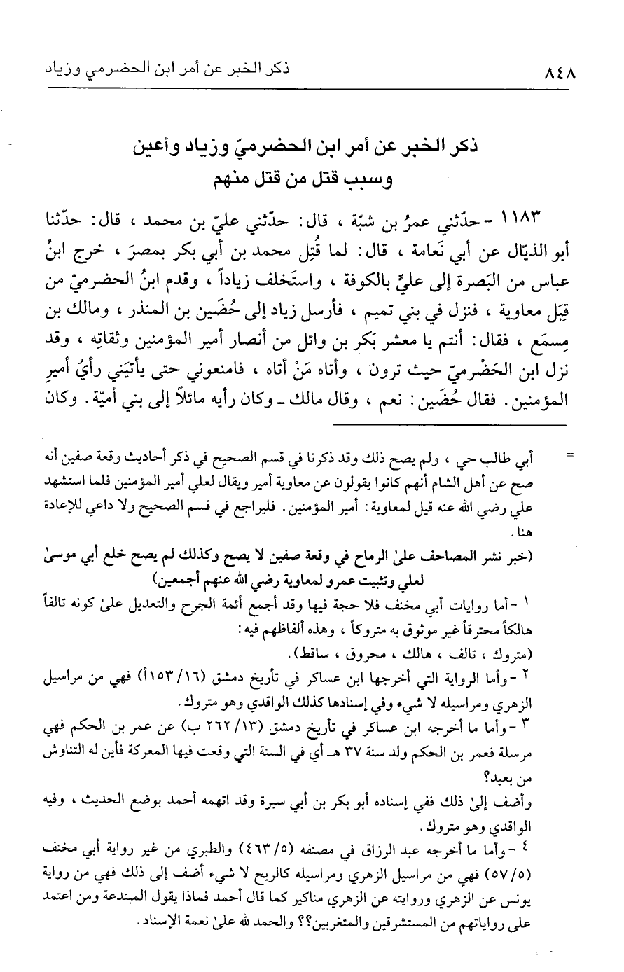 ١١٨٣ - حدّثني عمرُ بن شبّة، قال: حدّثني عليّ بن محمد، قال: حدّثنا أبو الذيّال عن أبي نَعامة، قال: لما قُتِل محمد بن أبي بكر بمصرَ، خرج ابنُ عباس من البَصرة إلى عليٍّ بالكوفة، واستَخلف زيادًا، وقدم ابنُ الحضرميّ من قِبَل معاوية، فنزل في بني تميم، فأرسل زياد إلى حُضَين بن المنذر، ومالك بن مِسمَع، فقال: أنتم يا معشر بَكر بن وائل من أنصار أمير المؤمنين وثقاتِه، وقد نزل ابن الحَضْرميّ حيث ترون، وأتاه مَنْ أتاه، فامنعوني حتى يأتيَني رأيُ أميرِ المؤمنين. فقال حُضَين: نعم، وقال مالك - وكان رأيه مائلًا إلى بني أميّة. وكان