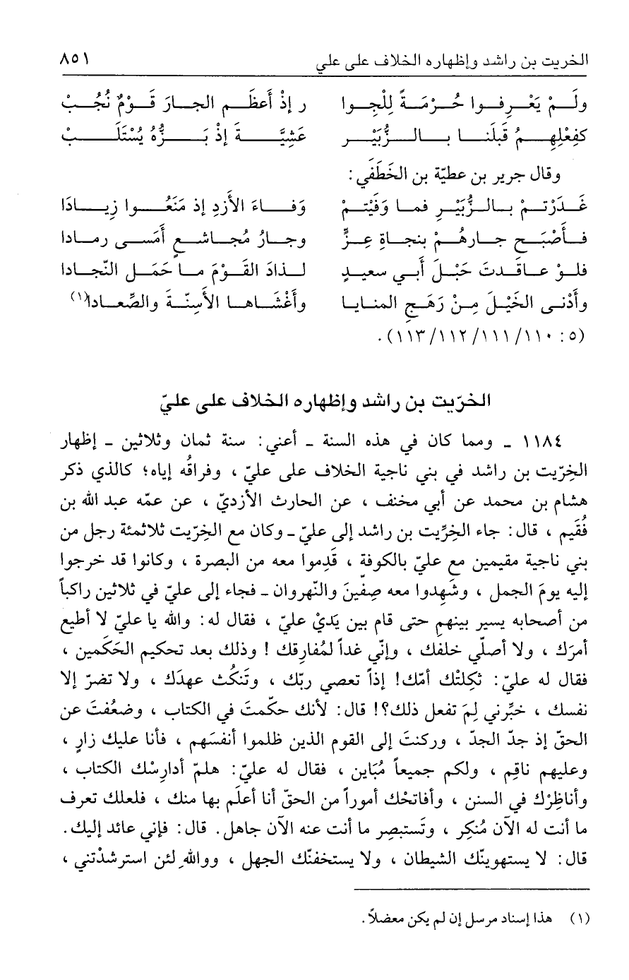 ١١٨٤ - ومما كان في هذه السنة - أعني: سنة ثمان وثلاثين - إظهار الخِرّيت بن راشد في بني ناجية الخلاف على عليّ، وفراقُه إياه؛ كالذي ذكر هشام بن محمد عن أبي مخنف، عن الحارث الأزديّ، عن عمّه عبد الله بن فُقَيم، قال: جاء الخِرِّيت بن راشد إلى عليّ - وكان مع الخِرّيت ثلاثمئة رجل من بني ناجية مقيمين مع على بالكوفة، قَدِموا معه من البصرة، وكانوا قد خرجوا إليه يومَ الجمل، وشَهِدوا معه صِفّينَ والنهروان - فجاء إلى عليّ في ثلاثين راكبًا من أصحابه يسير بينهم حتى قام بين يَديْ عليّ، فقال له: والله يا عليّ لا أطيع أمرَك، ولا أصلّي خلفك، وإنّي غدَا لمُفارِقك! وذلك بعد تحكيم الحَكَمين، فقال له على: ثكِلتْك أمّك! إذَا تعصي ربّك، وتَنكُث عهدَك، ولا تصرّ إلا نفسك، خبِّرني لِمَ تفعل ذلك؟ ! قال: لأنك حكّمتَ في الكتاب، وضعُفتَ عن الحقّ إذ جدّ الجدّ، وركنتَ إلى القوم الذين ظلموا أنفسَهم، فأنا عليك زارٍ، وعليهم ناقِم، ولكم جميعًا مُبَاين، فقال له عليّ: هلمّ أدارِسْك الكتاب، وأناظِرْك في السنن، وأفاتحْك أمورًا من الحقّ أنا أعلَم بها منك، فلعلك تعرف ما أنت له الآن مُنكِر، وتَستبصِر ما أنت عنه الآن جاهل. قال: فإني عائد إليك. قال: لا يستهوينّك الشيطان، ولا يستخفنّك الجهل، وواللهِ لئن استرشدْتني،