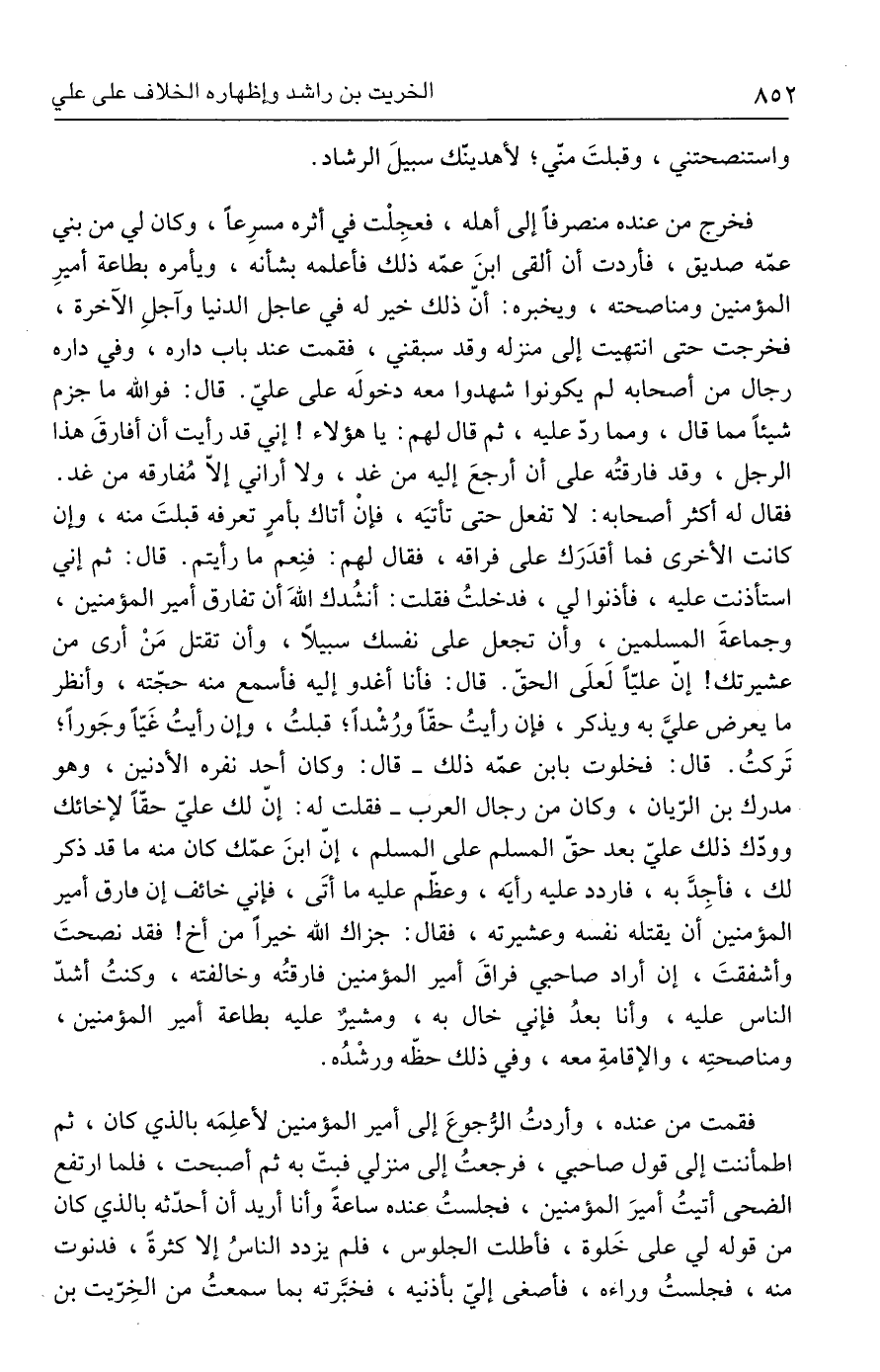 فخرج من عنده منصرفًا إلى أهله، فعجِلْت في أثره مسرِعًا، وكان لي من بني عمّه صديق، فأردت أن ألقى ابنَ عمّه ذلك فأعلمه بشأنه، ويأمره بطاعة أميرِ المؤمنين ومناصحته، ويخبره: أنّ ذلك خير له في عاجل الدنيا وآجلِ الآخرة، فخرجت حتى انتهيت إلى منزله وقد سبقني، فقمت عند باب داره، وفي داره رجال من أصحابه لم يكونوا شهدوا معه دخولَه على عليّ. قال: فوالله ما جزم شيئًا مما قال، ومما ردّ عليه، ثم قال لهم: يا هؤلاء! إني قد رأيت أن أفارقَ هذا الرجل، وقد فارقتُه على أن أرجعَ إليه من غد، ولا أراني إلّا مُفارقه من غد. فقال له أكثر أصحابه: لا تفعل حتى تأتيَه، فإنْ أتاك بأمير تعرفه قبلتَ منه، وإن كانت الأخرى فما أقدَرَك على فراقه، فقال لهم: فنِعم ما رأيتم. قال: ثم إني استأذنت عليه، فأذنوا لي، فدخلتُ فقلت: أنشُدك اللهَ أن تفارق أمير المؤمنين، وجماعةَ المسلمين، وأن تجعل على نفسك سبيلًا، وأن تقتل مَنْ أرى من عشيرتك! إنّ عليّا لَعلَى الحق. قال: فأنا أغدو إليه فأسمع منه حجّته، وأنظر ما يعرض عليَّ به ويذكر، فإن رأيتُ حقًّا ورُشْدًا؛ قبلتُ، وإن رأيتُ غَيًّا وجَورًا؛ تَركتُ. قال: فخلوت بابن عمّه ذلك - قال: وكان أحد نفره الأدنين، وهو مدرك بن الرّيان، وكان من رجال العرب - فقلت له: إنّ لك عليّ حقًّا لإخائك وودّك ذلك عليّ بعد حقّ المسلم على المسلم، إنّ ابنَ عمّك كان منه ما قد ذكر لك، فأجِدَّ به، فاردد عليه رأيَه، وعظّم عليه ما أتَى، فإني خائف إن فارق أمير المؤمنين أن يقتله نفسه وعشيرته، فقال: جزاك الله خيرًا من أخ! فقد نصحتَ وأشفقتَ، إن أراد صاحبي فراقَ أمير المؤمنين فارقتُه وخالفته، وكنتُ أشدّ الناس عليه، وأنا بعدُ فإني خال به، ومشير عليه بطاعة أمير المؤمنين، ومناصحتِه، والإقامةِ معه، وفي ذلك حظّه ورشْدُه.