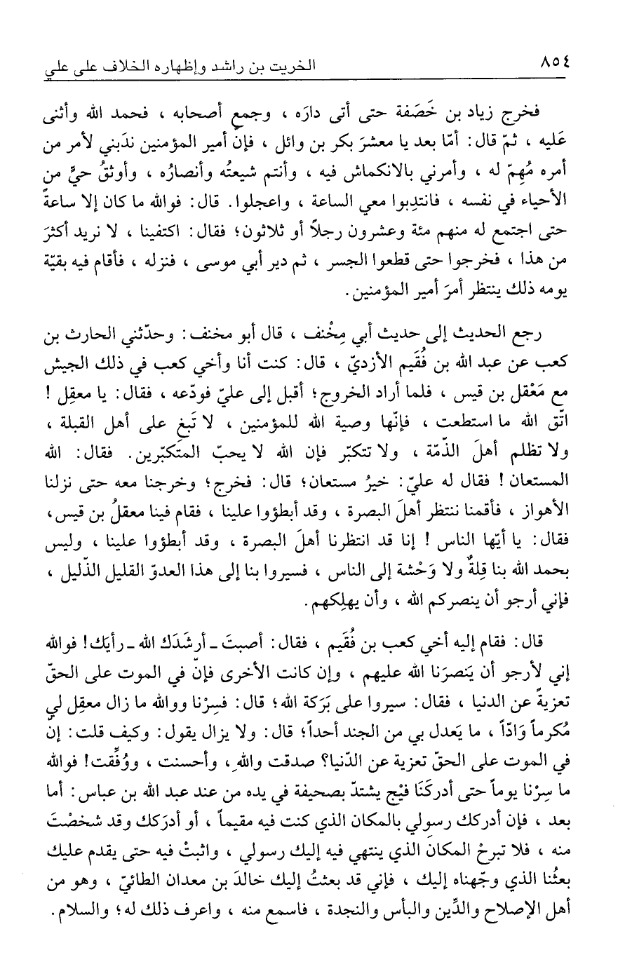 رجع الحديث إلى حديث أبي مِخْنف، قال أبو مخنف: وحدّثني الحارث بن كعب عن عبد الله بن فُقَيم الأزديّ، قال: كنت أنا وأخي كعب في ذلك الجيش مع مَعْقل بن قيس، فلما أراد الخروج؛ أقبل إلى عليّ فودّعه، فقال: يا معقِل! اتق الله ما استطعت، فإنّها وصية الله للمؤمنين، لا تَبغِ على أهل القبلة، ولا تظلم أهلَ الذّمّة، ولا تتكبّر فإن الله لا يحبّ المتكبّرين. فقال: الله المستعان! فقال له عليّ: خيرُ مستعان؛ قال: فخرج؛ وخرجنا معه حتى نزلنا الأهواز، فأقمنا ننتظر أهلَ البصرة، وقد أبطؤوا علينا، فقام فينا معقلُ بن قيس، فقال: يا أيّها الناس! إنا قد انتظرنا أهلَ البصرة، وقد أبطؤوا علينا، وليس بحمد الله بناقِلةٌ ولا وَحْشة إلى الناس، فسيروا بنا إلى هذا العدوّ القليل الذّليل، فإني أرجو أن ينصركم الله، وأن يهلِكهم.