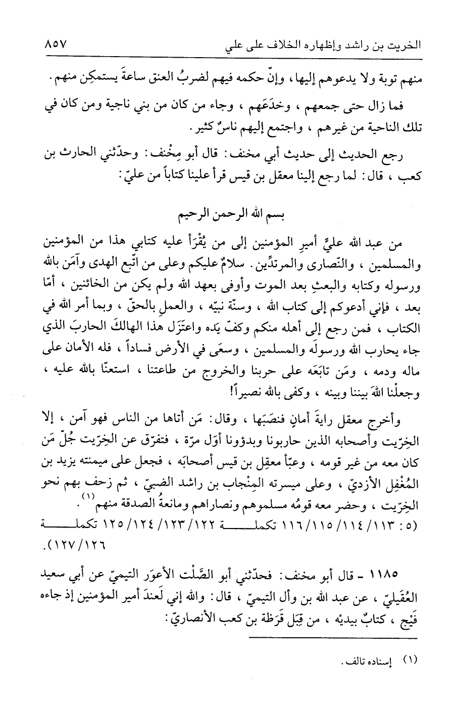 ١١٨٥ - قال أبو مخنف: فحدّثني أبو الصَّلْت الأعوَر التيميّ عن أبي سعيد العُقَيليّ، عن عبد الله بن وأل التيميّ، قال: والله إني لَعندَ أمير المؤمنين إذ جاءه فَيْج، كتابٌ بيديْه، من قِبَل قَرَظة بن كعب الأنصاريّ: