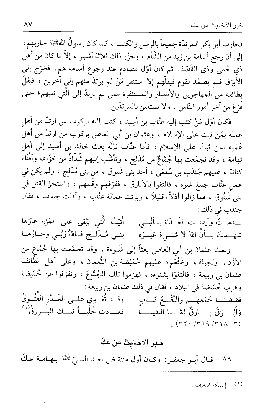٨٨ - قال أبو جعفر: وكان أول منتقض بعد النبيّ - صلى الله عليه وسلم - بتهامة عكّ