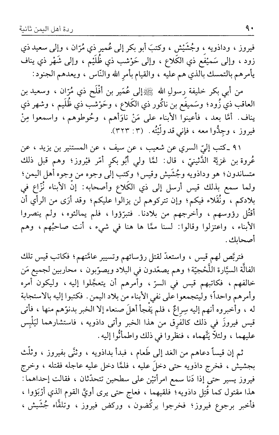 ٩١ - كتب إليّ السري عن شعيب، عن سيف، عن المستنير بن يزيد، عن عُروة بن غزيَّة الدَّثينيّ، قال: لمَّا ولي أبُو بكرٍ أمّر فيْروز؛ وهم قبل ذلك متساندون؛ هو وداذويه وجُشَيش وقيس؛ وكتب إلى وجوه من وجوه أهل اليمن؛ ولما سمع بذلك قيس أرسل إلى ذي الكَلاع وأصحابه: إنّ الأبناء نُزّاع في بلادكم، ونُقَلاء فيكم؛ وإن تتركوهم لن يزالوا عليكم؛ وقد أرَى من الرأي أن أقتُل رؤوسهم، وأخرجهم من بلادنا. فتبرّؤوا، فلم يمالئوه، ولم ينصروا الأبناء، واعتزلوا وقالوا: لسنا ممَّا ها هنا في شيء، أنت صاحبُهم، وهم أصحابك.