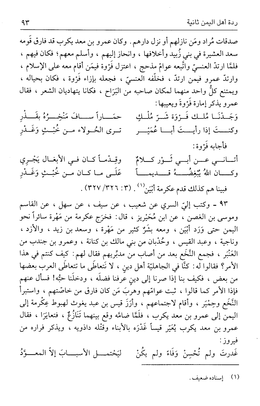 ٩٣ - وكتب إليّ السري عن شعيب، عن سيف، عن سهل، عن القاسم وموسى بن الغصن، عن ابن مُحَيْريز، قال: فخرَج عكرمة من مَهْرة سائرًا نحو اليمن حتى وَرَد أبْيَن، ومعه بشَرٌ كثير من مَهْرة، وسعد بن زيد، والأزد، وناجية، وعبد القيس، وحُدْبان من بني مالك بن كنانة، وعمرو بن جندب من العَنْبَر، فجمع النَّخَع بعد من أصاب من مدبِّريهم فقال لهم: كيف كنتم في هذا الأمر؟ فقالوا له: كنَّا في الجاهليّة أهل دينٍ، لا نَتعاطَى ما تتعاطَى العرب بعضها من بعض، فكيف بنا إذا صرنا إلى دينٍ عرفنا فضلَه، ودخلَنا حبُّه! فسأل عنهم فإذا الأمر كما قالوا، ثبت عوامّهم وهربَ مَن كان فارق من خاصّتهم، واستبرأ النَّخَع وحِمْيَر، وأقام لاجتماعهم، وأرَزَ قيس بن عبد يغوث لهبوط عِكْرمة إلى اليمن إلى عمرو بن معد يكرب، فلَمَّا ضامَّه وقع بينهما تَنَازُع، فتعايَرَا، فقال عمرو بن معد يكرب يُعَيّر قيسًا غَدْرَه بالأبناء وقتْله داذويه، ويذكر فراره من فيروز: