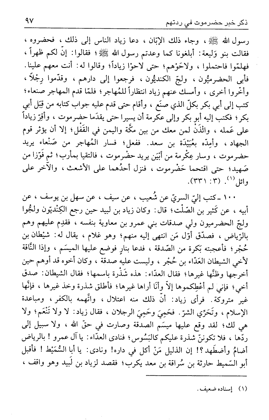 ١٠٠ - كتب إليّ السريّ عن شُعيب، عن سيف، عن سهل بن يوسف، عن أبيه، عن كَثير بن الصّلْت؛ قال: وكان زياد بن لبيد حين رجع الكِنْديّون ولجُّوا ولجّ الحضرميون ولي صدقات بني عمرو بن معاوية بنفسه، فقدِم عليهم وهم بالرّياض، فصدّق أوَّل مَن انتهى إليه منهم؛ وهو غلام، يقال له: شيْطان بن حُجْر؛ فأعجبته بَكرة من الصّدقة، فدعا بنارٍ فوضع عليها الميسَم، وإذا النّاقة لأخي الشيطان العَدّاء بن حُجْر، وليست عليه صدقة، وكان أخوه قد أوهم حين أخرجها وظنّها غيرها؛ فقال العدّاء: هذه شَذْرة باسمها؛ فقال الشيطان: صدق أخي؛ فإني لم أعْطِكموها إلّا وأنَا أراها غيرها؛ فأطلق شذرة وخذ غيرها، فإنَّها غير متروكة. فرأى زياد: أن ذلك منه اعتلال، واتَّهمه بالكفر، ومباعدة الإسلام، وتَحَرِّي الشرّ. فحمِيَ وحَمِيَ الرجلان، فقال زياد: لا ولا تَنْعَم؛ ولا هي لك؛ لقد وقع عليها ميسَم الصدقة وصارت في حقّ الله، ولا سبيل إلى ردّها، فلا تكوننّ شذرة عليكم كالبَسُوس؛ فنادى العدّاء: يا آل عمرو! بالرياض أضامُ وأضطهد؟ ! إن الذليل مَنْ أكل في داره! ونادى: يا أبا السُّمَيْط! فأقبل أبو السّميط حارثة بن سُراقة بن معد يكرب؛ فقصد لزياد بن لَبيد وهو واقف،