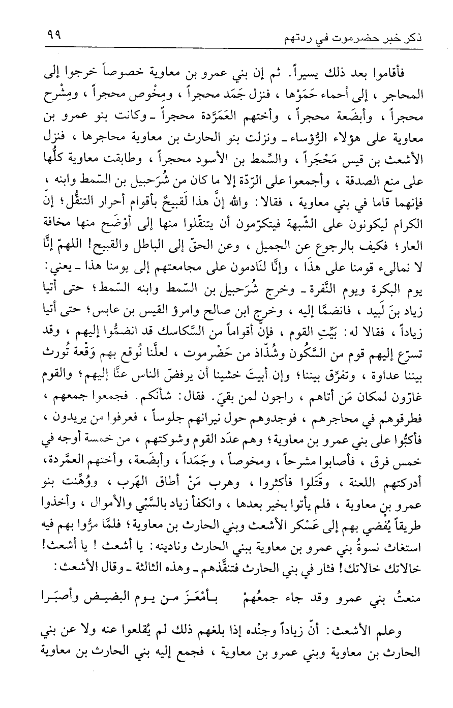 فأقاموا بعد ذلك يسيرًا. ثم إن بني عمرو بن معاوية خصوصًا خرجوا إلى المحاجر، إلى أحماء حَمَوْها، فنزل جَمَد محجرًا، ومِخْوص محجرًا، ومِشْرح محجرًا، وأبضَعة محجرًا، وأختهم العَمَرَّدة محجرًا -وكانت بنو عمرو بن معاوية على هؤلاء الرُّؤساء- ونزلت بنو الحارث بن معاوية محاجرها، فنزل الأشعث بن قيس مَحْجَرًا، والسِّمط بن الأسود محجرًا، وطابقت معاوية كلها على منع الصدقة، وأجمعوا على الرّدّة إلا ما كان من شُرَحبيل بن السّمط وابنه، فإنهما قاما في بني معاوية، فقالا: والله إنَّ هذا لَقبيحٌ بأقوام أحرار التنقُّل؛ إنّ الكرام ليكونون على الشّبهة فيتكرّمون أن يتنقّلوا منها إلى أوْضَح منها مخافة العار؛ فكيف بالرجوع عن الجميل، وعن الحقّ إلى الباطل والقبيح! اللهمّ إنَّا لا نمالئ قومنا على هذَا، وإنَّا لنَادمون على مجامعتهم إلى يومنا هذا -يعني: يوم البكرة ويوم النَّفرة- وخرج شُرَحبيل بن السّمط وابنه السّمط؛ حتى أتيا زياد بنَ لَبيد، فانضمَّا إليه، وخرج ابن صالح وامرؤ القيس بن عابس؛ حتى أتيا زيادًا، فقالا له: بيِّتِ القوم، فإن أقوامًا من السَّكاسك قد انضمُّوا إليهم، وقد تسرّع إليهم قوم من السَّكُون وشُذّاذ من حَضْرموت، لعلَّنا نُوقع بهم وَقْعة تُورث بيننا عداوة، وتفرِّق بيننا؛ وإن أبيتَ خشينا أن يرفضّ الناس عنَّا إليهم؛ والقوم غارّون لمكان مَن أتاهم، راجون لمن بقيَ. فقال: شأنكم. فجمعوا جمعهم، فطرقوهم في محاجرهم، فوجدوهم حول نيرانهم جلوسًا، فعرفوا من يريدون، فأكبُّوا على بني عمرو بن معاوية؛ وهم عدَد القوم وشوكتهم، من خمسة أوجه في خمس فرق، فأصابوا مشرحًا، ومخوصًا، وجَمَدًا، وأبضَعة، وأختهم العمَّردة، أدركتهم اللعنة، وقَتَلوا فأكثروا، وهرب مَنْ أطاق الهَرب، ووُهِّنت بنو عمرو بن معاوية، فلم يأتوا بخير بعدها، وانكفأ زياد بالسَّبْي والأموال، وأخذوا طريقًا يُفْضي بهم إلى عَسْكر الأشعث وبني الحارث بن معاوية؛ فلمَّا مرُّوا بهم فيه استغاث نسوةُ بني عمرو بن معاوية ببني الحارث ونادينه: يا أشعث! يا أشعث! خالاتك خالاتك! فثار في بني الحارث فتنقَّذهم -وهذه الثالثة- وقال الأشعث: