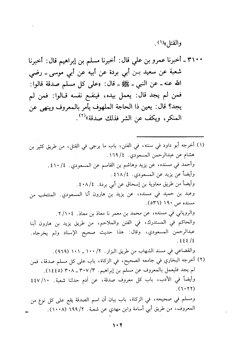 3100 - أَخْبَرَنَا عَمْرُو بْنُ عَلِيٍّ، قَالَ: أَخْبَرَنَا مُسْلِمُ بْنُ إِبْرَاهِيمَ، قَالَ: أَخْبَرَنَا شُعْبَةُ، عَنْ سَعِيدِ بْنِ أَبِي بُرْدَةَ، عَنْ أَبِيهِ، عَنْ أَبِي مُوسَى رَضِيَ اللَّهُ عَنْهُ عَنِ النَّبِيِّ صَلَّى اللهُ عَلَيْهِ وَسَلَّمَ قَالَ: «§عَلَى كُلِّ مُسْلِمٍ صَدَقَةٌ» ، قَالُوا: فَمَنْ لَمْ يَجِدْ قَالَ: «يَعْمَلُ بِيَدِهِ فَيَنْفَعُ نَفْسَهُ» ، قَالُوا: فَمَنْ لَمْ يَجِدْ، قَالَ: «يُعِينُ ذَا الْحَاجَةِ الْمَلْهُوفَ، يَأْمُرُ بِالْمَعْرُوفِ وَيَنْهَى عَنِ الْمُنْكَرِ وَيَكُفُّ عَنِ الشَّرِّ فَذَلِكَ صَدَقَةٌ» -[103]-، وَهَذَا الْحَدِيثُ لَا نَعْلَمُ أَحَدًا أَسْنَدَهُ عَنْ سَعِيدِ بْنِ أَبِي بُرْدَةَ إِلَّا شُعْبَةُ