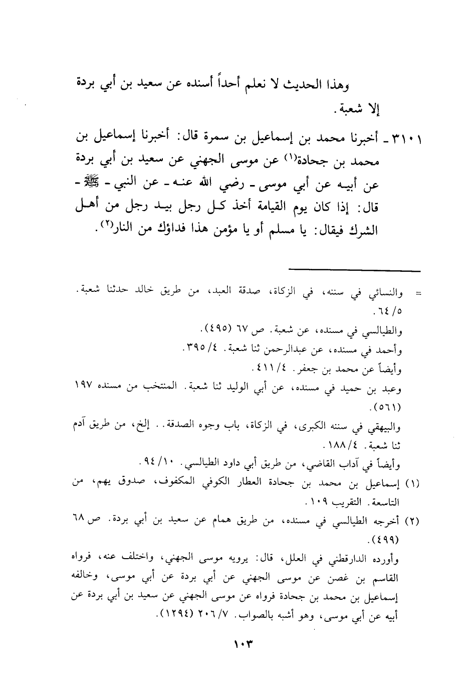 3101 - أَخْبَرَنَا مُحَمَّدُ بْنُ إِسْمَاعِيلَ بْنِ سَمُرَةَ، قَالَ: أَخْبَرَنَا إِسْمَاعِيلُ بْنُ مُحَمَّدِ بْنِ جُحَادَةَ، عَنْ مُوسَى الْجُهَنِيِّ، عَنْ سَعِيدِ بْنِ أَبِي بُرْدَةَ، عَنْ أَبِيهِ، عَنْ أَبِي مُوسَى رَضِيَ اللَّهُ عَنْهُ عَنِ النَّبِيِّ صَلَّى اللهُ عَلَيْهِ وَسَلَّمَ قَالَ: " §إِذَا كَانَ يَوْمُ الْقِيَامَةِ أَخَذَ كُلُّ رَجُلٍ بِيَدِ رَجُلٍ مِنْ أَهْلِ الشِّرْكِ، فَيُقَالُ: يَا مُسْلِمُ أَوْ يَا مُؤْمِنُ هَذَا فِدَاؤُكَ مِنَ النَّارِ " -[104]-، وَلَا نَعْلَمُ رَوَى مُوسَى الْجُهَنِيُّ عَنْ سَعِيدِ بْنِ أَبِي بُرْدَةَ عَنْ أَبِيهِ عَنْ أَبِي مُوسَى إِلَّا هَذَا الْحَدِيثَ