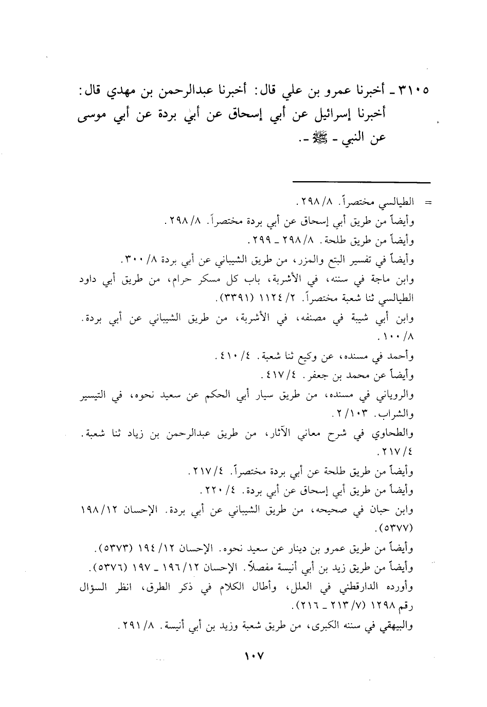 3107 - وَأَخْبَرَنَاهُ عَمْرُو بْنُ عَلِيٍّ، قَالَ: أَخْبَرَنَا عَبْدُ الرَّحْمَنِ، عَنْ سُفْيَانَ، عَنْ أَبِي إِسْحَاقَ، عَنْ أَبِي بُرْدَةَ، عَنِ النَّبِيِّ صَلَّى اللهُ عَلَيْهِ وَسَلَّمَ وَلَمْ يَذْكُرْ أَبَا مُوسَى -[110]- قَالَ أَبُو بَكْرٍ: وَقَدْ أَسْنَدَهُ بِشْرُ بْنُ مَنْصُورٍ وَجَعْفَرُ بْنُ عَوْنٍ