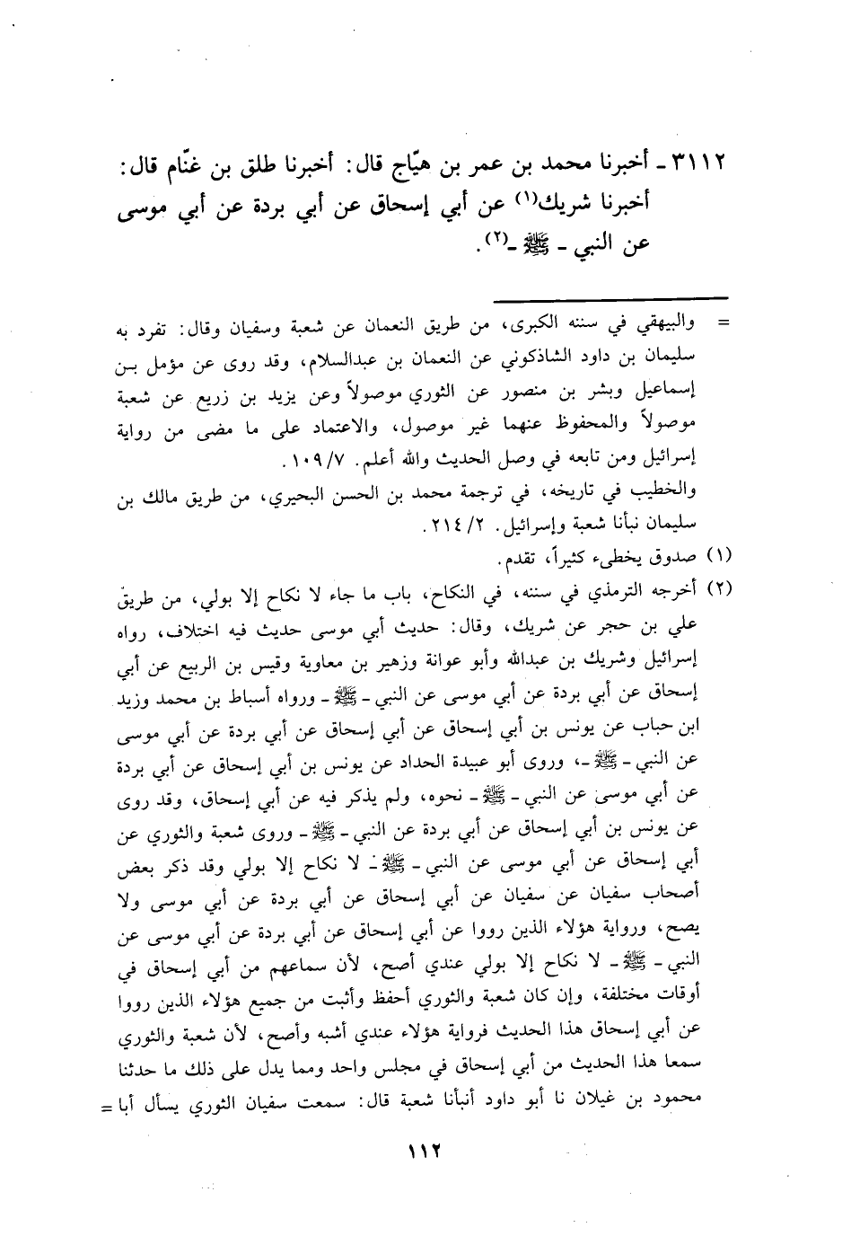 3116 - وَأَخْبَرَنَا أَحْمَدُ بْنُ عُثْمَانَ بْنِ حَكِيمٍ الْأَوْدِيُّ، قَالَ: أَخْبَرَنَا -[115]- عَبْدُ الرَّحْمَنِ بْنُ شَرِيكٍ، عَنْ أَبِيهِ، عَنْ أَبِي إِسْحَاقَ، عَنْ أَبِي بُرْدَةَ، عَنْ أَبِي مُوسَى، رَضِيَ اللَّهُ عَنْهُ عَنِ النَّبِيِّ صَلَّى اللهُ عَلَيْهِ وَسَلَّمَ أَنَّهُ قَالَ: «§لَا نِكَاحَ إِلَّا بِوَلِيٍّ» قَالَ أَبُو بَكْرٍ: وَالْحَدِيثُ لِمَنْ زَادَ إِذَا كَانَ حَافِظًا، وَإِسْرَائِيلُ حَافِظٌ عَنْ أَبِي إِسْحَاقَ، وَالَّذِينَ رَوَوْهُ عَنْ شُعْبَةَ وَالثَّوْرِيِّ عَنْ أَبِي إِسْحَاقَ عَنْ أَبِي بُرْدَةَ، أَنَّ النَّبِيَّ صَلَّى اللهُ عَلَيْهِ وَسَلَّمَ قَالَ: «لَا نِكَاحَ إِلَّا بِوَلِيٍّ» ، فَالَّذِينَ قَالُوا: عَنْ أَبِي بُرْدَةَ عَنْ أَبِي مُوسَى قَدْ جَاءُوا بِمَا جَاءَ بِهِ شُعْبَةُ وَالثَّوْرِيُّ، وَإِسْرَائِيلُ لَا يَدْفَعُ عَنْ حَدِيثِ أَبِي إِسْحَاقَ، وَعَنْ حِفْظِهِ لَهُ، قَالَ أَبُو بَكْرٍ: وَإِنَّمَا بَلَغَنِي أَنَّ الثَّوْرِيَّ وَشُعْبَةَ قَالَا لِأَبِي إِسْحَاقَ: حَدَّثَكَ أَبُو بُرْدَةَ عَنِ النَّبِيِّ صَلَّى اللهُ عَلَيْهِ وَسَلَّمَ فَقَالَ: نَعَمْ، وَلَمْ يَبْلُغْنَا أَنَّهُمَا قَالَا: حَدَّثَكَ أَبُو بُرْدَةَ، فَقَالَ: لَا إِنَّمَا حَدَّثَنِيهُ أَبُو بُرْدَةَ عَلَى أَنَّ يُونُسَ بْنَ أَبِي إِسْحَاقَ ثِقَةٌ وَشَرِيكٌ وَقَيْسٌ قَدْ تَابَعَا إِسْرَائِيلَ عَلَى إِسْنَادِهِ وَتَوْصِيلِهِ، وَبِشْرُ بْنُ مَنْصُورٍ وَكَانَ مِنْ خِيَارِ النَّاسِ قَدْ أَسْنَدَهُ عَنْ سُفْيَانَ، وَجَعْفَرُ بْنُ عَوْنٍ قَدْ أَسْنَدَهُ أَيْضًا عَنْ سُفْيَانَ، وَلَا نَعْلَمُ فِيمَا رَوَى جَعْفَرُ بْنُ عَوْنٍ أَحَادِيثَ يُعَدُّ عَلَيْهِ أَنَّهُ أَخْطَأَ فِيهَا فَيُعَدُّ هَذَا مِنْ خَطَئِهِ فَالْحَدِيثُ عِنْدَنَا قَدْ تَوَاصَلَتْ بِهِ الْأَخْبَارُ فِي اتَّصَالِهِ وَرَفْعِهِ وَإِنْ قَصَّرَ بِهِ مُقَصِّرٌ فَالْخَبَرُ ثَابِتٌ عَنْ رَسُولِ اللَّهِ صَلَّى اللهُ عَلَيْهِ وَسَلَّمَ