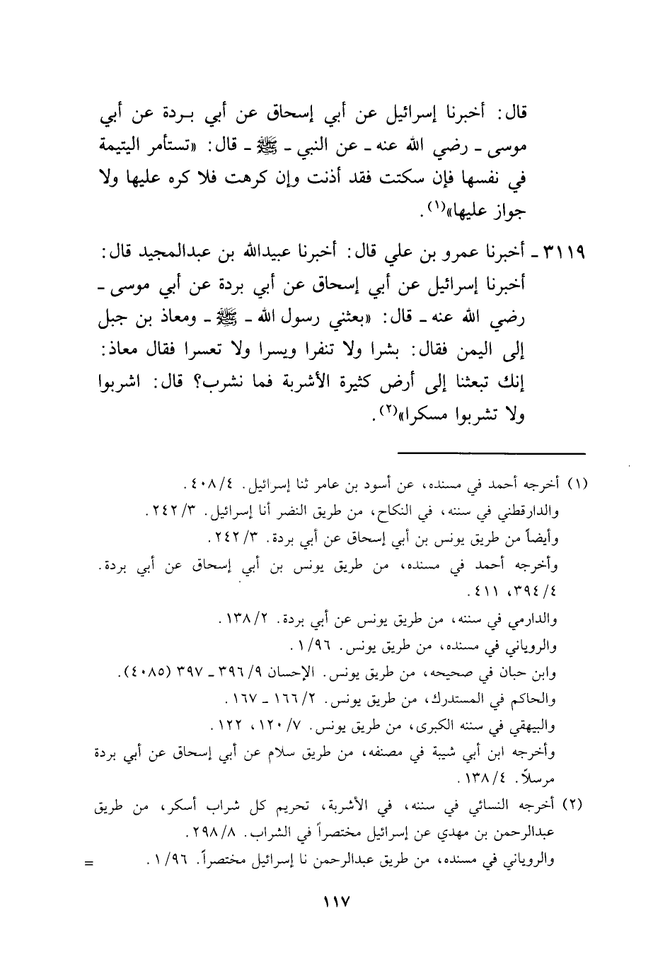 3119 - أَخْبَرَنَا عَمْرُو بْنُ عَلِيٍّ، قَالَ: أَخْبَرَنَا عُبَيْدُ اللَّهِ بْنُ عَبْدِ الْمَجِيدِ، قَالَ: أَخْبَرَنَا إِسْرَائِيلُ، عَنْ أَبِي إِسْحَاقَ، عَنْ أَبِي بُرْدَةَ، عَنْ أَبِي مُوسَى، رَضِيَ اللَّهُ عَنْهُ قَالَ: بَعَثَنِي رَسُولُ اللَّهِ صَلَّى اللهُ عَلَيْهِ وَسَلَّمَ وَمُعَاذُ بْنُ جَبَلٍ إِلَى الْيَمَنِ فَقَالَ: «§بَشِّرَا وَلَا تُنَفِّرَا، وَيَسِّرَا وَلَا تُعَسِّرَا» ، فَقَالَ مُعَاذٌ: إِنَّكَ تَبْعَثُنَا إِلَى أَرْضٍ كَثِيرَةِ الْأَشْرِبَةِ، فَمَا نَشْرَبُ؟، قَالَ: «اشْرَبُوا وَلَا تَشْرَبُوا مُسْكِرًا»