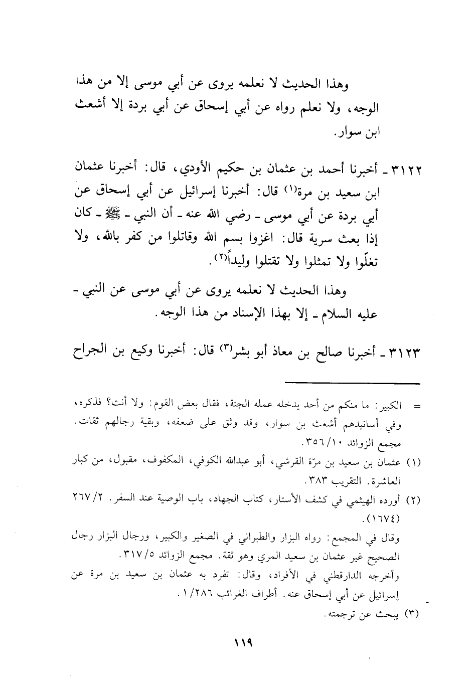 3122 - أَخْبَرَنَا أَحْمَدُ بْنُ عُثْمَانَ بْنِ حَكِيمٍ الْأَوْدِيُّ، قَالَ: أَخْبَرَنَا عُثْمَانُ بْنُ سَعِيدِ بْنِ مُرَّةَ، قَالَ: أَخْبَرَنَا إِسْرَائِيلُ، عَنْ أَبِي إِسْحَاقَ، عَنْ أَبِي بُرْدَةَ، عَنْ أَبِي مُوسَى، رَضِيَ اللَّهُ عَنْهُ أَنَّ النَّبِيَّ صَلَّى اللهُ عَلَيْهِ وَسَلَّمَ كَانَ إِذَا بَعَثَ سَرِيَّةً، قَالَ: «§اغْزُوا بِسْمِ اللَّهِ وَقَاتِلُوا مَنْ كَفَرَ بِاللَّهِ وَلَا تَغُلُّوا وَلَا تُمَثِّلُوا وَلَا تَقْتُلُوا وَلِيدًا» ، وَهَذَا الْحَدِيثُ لَا نَعْلَمُهُ يُرْوَى عَنْ أَبِي مُوسَى عَنِ النَّبِيِّ عَلَيْهِ السَّلَامُ إِلَّا بِهَذَا الْإِسْنَادِ مِنْ هَذَا الْوَجْهِ