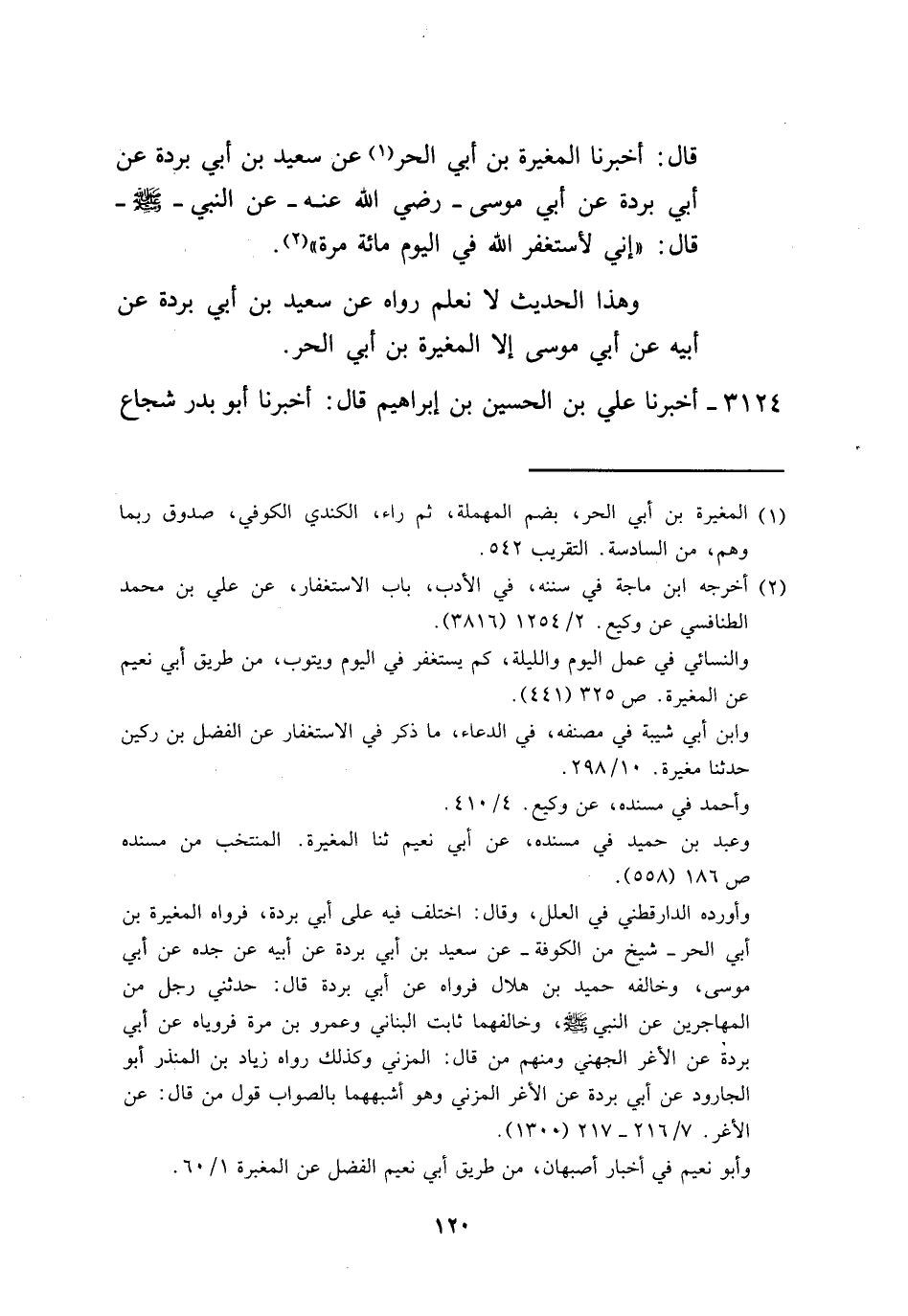 3124 - أَخْبَرَنَا عَلِيُّ بْنُ الْحُسَيْنِ بْنِ إِبْرَاهِيمَ، قَالَ: أَخْبَرَنَا أَبُو بَدْرٍ شُجَاعُ -[121]- بْنُ الْوَلِيدِ، قَالَ: أَخْبَرَنَا زِيَادُ بْنُ خَيْثَمَةَ، عَنْ أَبِي إِسْحَاقَ، عَنْ دَارِمٍ، عَنْ سَعِيدِ بْنِ أَبِي بُرْدَةَ، عَنْ أَبِيهِ، عَنْ أَبِي مُوسَى، رَضِيَ اللَّهُ عَنْهُ قَالَ: قَالَ رَسُولُ اللَّهِ صَلَّى اللهُ عَلَيْهِ وَسَلَّمَ: «§إِنِّي قَدْ بَدَّنْتُ، فَإِذَا رَكَعْتُ فَارْكَعُوا، وَإِذَا رَفَعْتُ فَارْفَعُوا، وَإِذَا سَجَدْتُ فَاسْجُدُوا، وَلَا أَلْفِيَنَّ أَحَدًا يَسْبِقُنِي إِلَى رُكُوعٍ وَلَا إِلَى سُجُودٍ» وَهَذَا الْحَدِيثُ لَا نَعْلَمُهُ يُرْوَى عَنْ أَبِي مُوسَى إِلَّا بِهَذَا الْإِسْنَادِ وَلَا رَوَى هَذَا الْحَدِيثَ عَنْ أَبِي إِسْحَاقَ إِلَّا زِيَادُ بْنُ خَيْثَمَةَ
