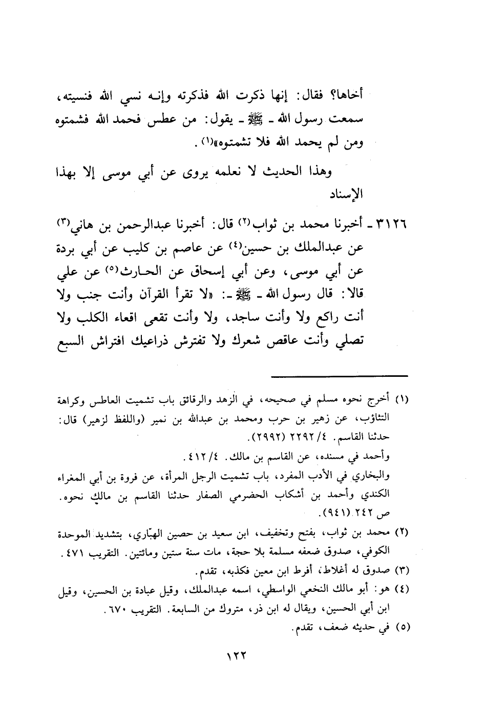 3126 - أَخْبَرَنَا مُحَمَّدُ بْنُ ثَوَابٍ، قَالَ: أَخْبَرَنَا عَبْدُ الرَّحْمَنِ بْنُ هَانِئٍ، عَنْ عَبْدِ الْمَلِكِ بْنِ حُسَيْنٍ، عَنْ عَاصِمِ بْنِ كُلَيْبٍ، عَنْ أَبِي بُرْدَةَ، عَنْ أَبِي مُوسَى، وَعَنْ أَبِي إِسْحَاقَ، عَنِ الْحَارِثِ، عَنْ عَلِيٍّ، قَالَا: قَالَ رَسُولُ اللَّهِ صَلَّى اللهُ عَلَيْهِ وَسَلَّمَ: «§لَا تَقْرَأُ الْقُرْآنَ وَأَنْتَ جُنُبٌ، وَلَا أَنْتَ رَاكِعٌ، وَلَا وَأَنْتَ سَاجِدٌ، وَلَا وَأَنْتَ تَقْعَى إِقْعَاءَ الْكَلْبِ، وَلَا تُصَلِّي وَأَنْتَ عَاقِصٌ شَعْرَكَ، وَلَا تَفْتَرِشْ ذِرَاعَيْكَ افْتِرَاشَ السَّبْعِ -[123]-، وَلَا تَلْبَسِ الْقِسِيَّ، وَلَا تَخَتَّمَ بِالذَّهَبِ وَلَا تَلْبَسْ خَاتَمَكَ فِي هَاتَيْنِ - يَعْنِي السَّبَّابَةَ وَالْوُسْطَى» ، وَهَذَا الْحَدِيثُ إِنَّمَا يُعْرَفُ عَنْ عَلِيِّ بْنِ أَبِي طَالِبٍ فَجَمَعَ هَذَا الرَّجُلُ فِيهِ أَبَا مُوسَى مَعَ عَلِيٍّ وَلَا نَعْلَمُ أَحَدًا جَمَعَهُمَا إِلَّا عَبْدَ الْمَلِكِ بْنِ حُسَيْنٍ وَلَمْ يُتَابَعْ عَلَيْهِ