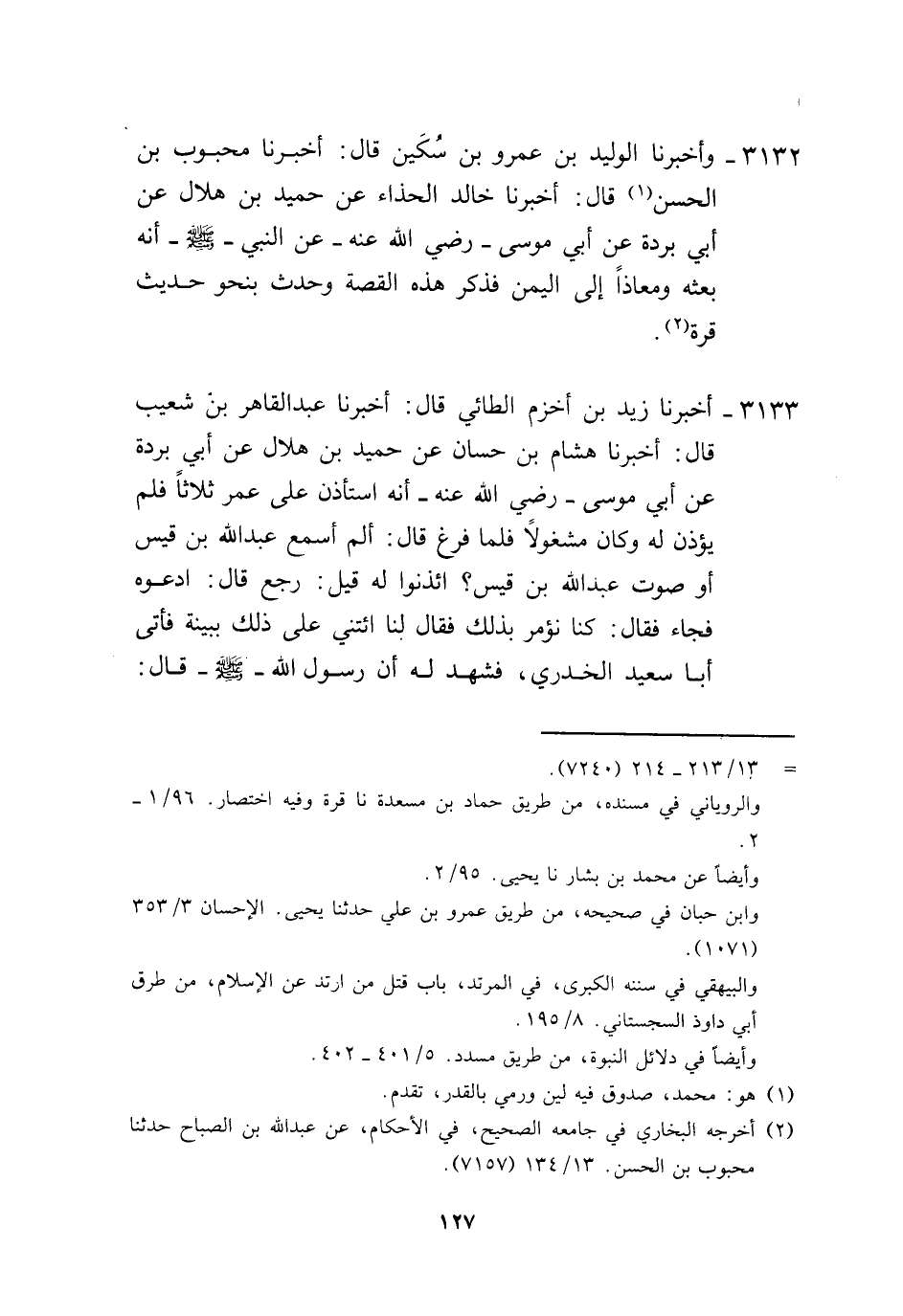 3132 - وَأَخْبَرَنَا الْوَلِيدُ بْنُ عَمْرِو بْنِ سِكِّينٍ، قَالَ: أَخْبَرَنَا مَحْبُوبُ بْنُ الْحَسَنِ، قَالَ: أَخْبَرَنَا خَالِدٌ الْحَذَّاءُ، عَنْ حُمَيْدِ بْنِ هِلَالٍ، عَنْ أَبِي بُرْدَةَ، عَنْ أَبِي مُوسَى، رَضِيَ اللَّهُ عَنْهُ عَنِ النَّبِيِّ صَلَّى اللهُ عَلَيْهِ وَسَلَّمَ §أَنَّهُ بَعَثَهُ وَمُعَاذًا إِلَى الْيَمَنِ، فَذَكَرَ هَذِهِ الْقِصَّةَ وَحَدَّثَ بِنَحْوِ حَدِيثِ قُرَّةَ