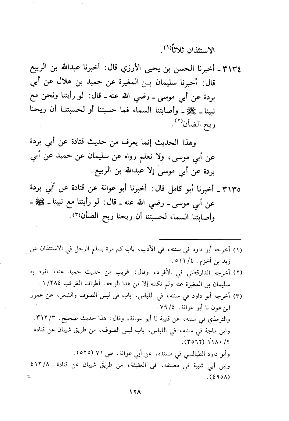 3134 - أَخْبَرَنَا الْحَسَنُ بْنُ يَحْيَى الْأُرُزِّيُّ، قَالَ: أَخْبَرَنَا عَبْدُ اللَّهِ بْنُ الرَّبِيعِ، قَالَ: أَخْبَرَنَا سُلَيْمَانُ بْنُ الْمُغِيرَةِ، عَنْ حُمَيْدِ بْنِ هِلَالٍ، عَنْ أَبِي بُرْدَةَ، عَنْ أَبِي مُوسَى، رَضِيَ اللَّهُ عَنْهُ قَالَ: «لَوْ رَأَيْتَنَا §وَنَحْنُ مَعَ نَبِيِّنَا صَلَّى اللهُ عَلَيْهِ وَسَلَّمَ وَأَصَابَتْنَا السَّمَاءُ، فَمَا حَسِبْتَنَا أَوْ لَحَسِبْتَنَا أَنَّ رِيحَنَا رِيحُ الضَّأْنِ» وَهَذَا الْحَدِيثُ إِنَّمَا يُعْرَفُ مِنْ حَدِيثِ قَتَادَةَ عَنْ أَبِي بُرْدَةَ عَنْ أَبِي مُوسَى وَلَا نَعْلَمُ رَوَاهُ عَنْ سُلَيْمَانَ عَنْ حُمَيْدٍ عَنْ أَبِي بُرْدَةَ عَنْ أَبِي مُوسَى إِلَّا عَبْدُ اللَّهِ بْنُ الرَّبِيعِ