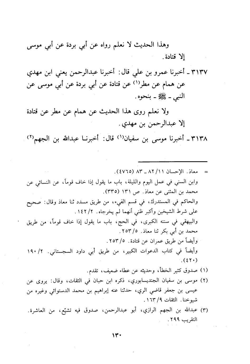 3138 - أَخْبَرَنَا مُوسَى بْنُ سُفْيَانَ، قَالَ: أَخْبَرَنَا عَبْدُ اللَّهِ بْنُ الْجَهْمِ -[131]-، قَالَ: أَخْبَرَنَا عَمْرُو بْنُ أَبِي قَيْسٍ، عَنِ ابْنِ أَبِي لَيْلَى، عَنِ الشَّعْبِيِّ، عَنْ أَبِي بُرْدَةَ، عَنْ أَبِي مُوسَى، رَضِيَ اللَّهُ عَنْهُ أَنَّ النَّبِيَّ صَلَّى اللهُ عَلَيْهِ وَسَلَّمَ بَعَثَهُ وَبَعَثَ مُعَاذَ بْنَ جَبَلٍ إِلَى الْيَمَنِ فَقَالَ: «§يَسِّرَا وَلَا تُعَسِّرَا، وَبَشِّرَا وَلَا تُنَفِّرَا» ، وَهَذَا الْحَدِيثُ لَا نَعْلَمُ رَوَاهُ عَنِ الشَّعْبِيِّ عَنْ أَبِي بُرْدَةَ عَنْ أَبِي مُوسَى إِلَّا ابْنُ أَبِي لَيْلَى، وَلَا رَوَاهُ عَنِ ابْنِ أَبِي لَيْلَى إِلَّا عَمْرُو بْنُ أَبِي قَيْسٍ