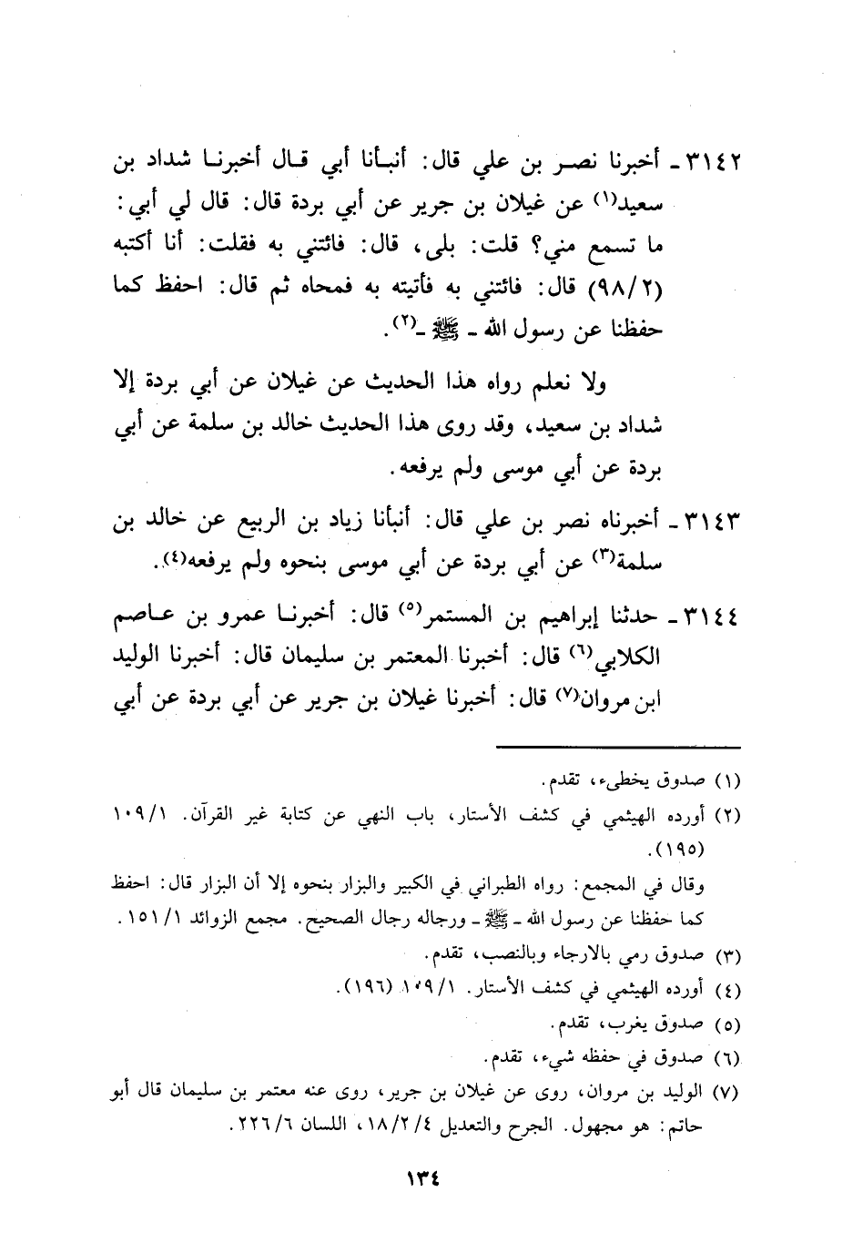 3142 - أَخْبَرَنَا نَصْرُ بْنُ عَلِيٍّ، قَالَ: أَنْبَأَنَا أَبِي، قَالَ: أَخْبَرَنَا شَدَّادُ بْنُ سَعِيدٍ، عَنْ غَيْلَانَ بْنِ جَرِيرٍ، عَنْ أَبِي بُرْدَةَ، قَالَ: قَالَ لِي أَبِي: «مَا تَسْمَعُ مِنِّي؟» ، قُلْتُ: بَلَى، قَالَ: «فَائْتِنِي بِهِ» ، فَقُلْتُ: أَنَا أَكْتُبُهُ، قَالَ: «فَائْتِنِي بِهِ» ، فَأَتَيْتُهُ بِهِ فَمَحَاهُ، ثُمَّ قَالَ: «§احْفَظْ كَمَا حَفِظْنَا عَنْ رَسُولِ اللَّهِ» ، وَلَا نَعْلَمُ رَوَى هَذَا الْحَدِيثَ عَنْ غَيْلَانَ عَنْ أَبِي بُرْدَةَ إِلَّا شَدَّادُ بْنُ سَعِيدٍ وَقَدْ رَوَى هَذَا الْحَدِيثَ خَالِدُ بْنُ سَلَمَةَ عَنْ أَبِي بُرْدَةَ عَنْ أَبِي مُوسَى وَلَمْ يَرْفَعْهُ،
