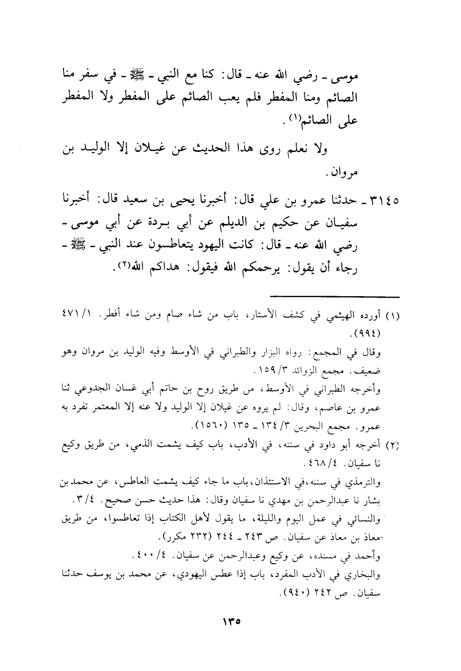 3145 - حَدَّثَنَا عَمْرُو بْنُ عَلِيٍّ، قَالَ: أَخْبَرَنَا يَحْيَى بْنُ سَعِيدٍ، قَالَ: أَخْبَرَنَا سُفْيَانُ، عَنْ حَكِيمِ بْنِ الدَّيْلَمِ، عَنْ أَبِي بُرْدَةَ، عَنْ أَبِي مُوسَى، رَضِيَ اللَّهُ عَنْهُ، قَالَ: كَانَتِ الْيَهُودُ يَتَعَاطَسُونَ عِنْدَ النَّبِيِّ صَلَّى اللهُ عَلَيْهِ وَسَلَّمَ رَجَاءَ أَنْ يَقُولَ يَرْحَمُكُمُ اللَّهُ، فَيَقُولُ: «§هَدَاكُمُ اللَّهُ» -[136]-، وَهَذَا الْحَدِيثُ لَا نَعْلَمُهُ يُرْوَى عَنْ أَبِي مُوسَى إِلَّا بِهَذَا الْإِسْنَادِ