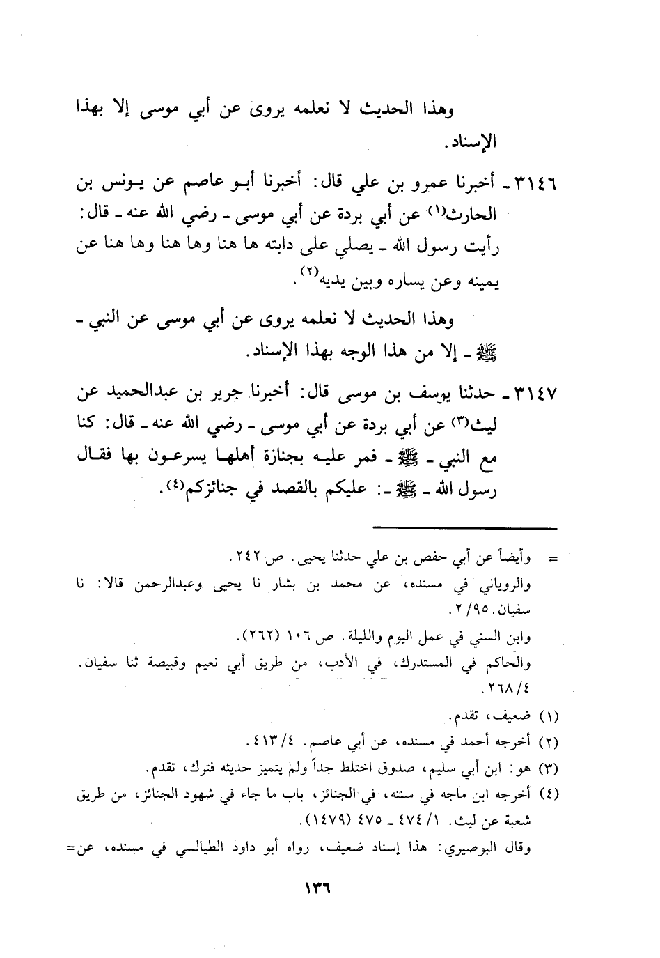 3147 - حَدَّثَنَا يُوسُفُ بْنُ مُوسَى، قَالَ: أَخْبَرَنَا جَرِيرُ بْنُ عَبْدِ الْحَمِيدِ، عَنْ لَيْثٍ، عَنْ أَبِي بُرْدَةَ، عَنْ أَبِي مُوسَى رَضِيَ اللَّهُ عَنْهُ قَالَ: كُنَّا مَعَ النَّبِيِّ صَلَّى اللهُ عَلَيْهِ وَسَلَّمَ، فَمَرَّ عَلَيْهِ بِجِنَازَةٍ أَهْلُهَا يُسْرِعُونَ بِهَا، فَقَالَ رَسُولُ اللَّهِ صَلَّى اللهُ عَلَيْهِ وَسَلَّمَ: «§عَلَيْكُمْ بِالْقَصْدِ فِي جَنَائِزِكُمْ» -[137]- وَهَذَا الْحَدِيثُ قَدْ رَوَاهُ جَمَاعَةٌ عَنْ لَيْثٍ عَنْ أَبِي بُرْدَةَ عَنْ أَبِي مُوسَى وَلَا نَعْلَمُ لَهُ إِلَّا هَذَا الطَّرِيقَ