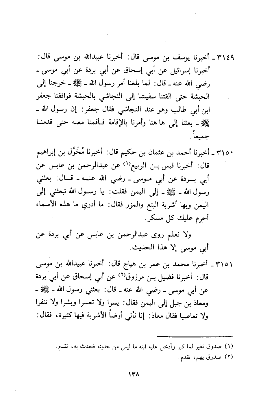 3150 - أَخْبَرَنَا أَحْمَدُ بْنُ عُثْمَانَ بْنِ حَكِيمٍ، قَالَ: أَخْبَرَنَا مُخَوَّلُ بْنُ إِبْرَاهِيمَ، قَالَ: أَخْبَرَنَا قَيْسُ بْنُ الرَّبِيعِ، عَنْ عَبْدِ الرَّحْمَنِ بْنِ عَابِسٍ، عَنْ أَبِي بُرْدَةَ، عَنْ أَبِي مُوسَى، رَضِيَ اللَّهُ عَنْهُ قَالَ: بَعَثَنِي رَسُولُ اللَّهِ صَلَّى اللهُ عَلَيْهِ وَسَلَّمَ إِلَى الْيَمَنِ، فَقُلْتُ: يَا رَسُولَ اللَّهِ، تَبْعَثُنِي إِلَى الْيَمَنِ وَبِهَا أَشْرِبَةُ الْبِتْعِ وَالْمِزْرِ، فَقَالَ: «مَا أَدْرِي مَا هَذِهِ الْأَسْمَاءُ، §أُحَرِّمُ عَلَيْكَ كُلَّ مُسْكِرٍ» ، وَلَا نَعْلَمُ رَوَى عَبْدُ الرَّحْمَنِ بْنُ عَابِسٍ عَنْ أَبِي بُرْدَةَ عَنْ أَبِي مُوسَى إِلَّا هَذَا الْحَدِيثَ