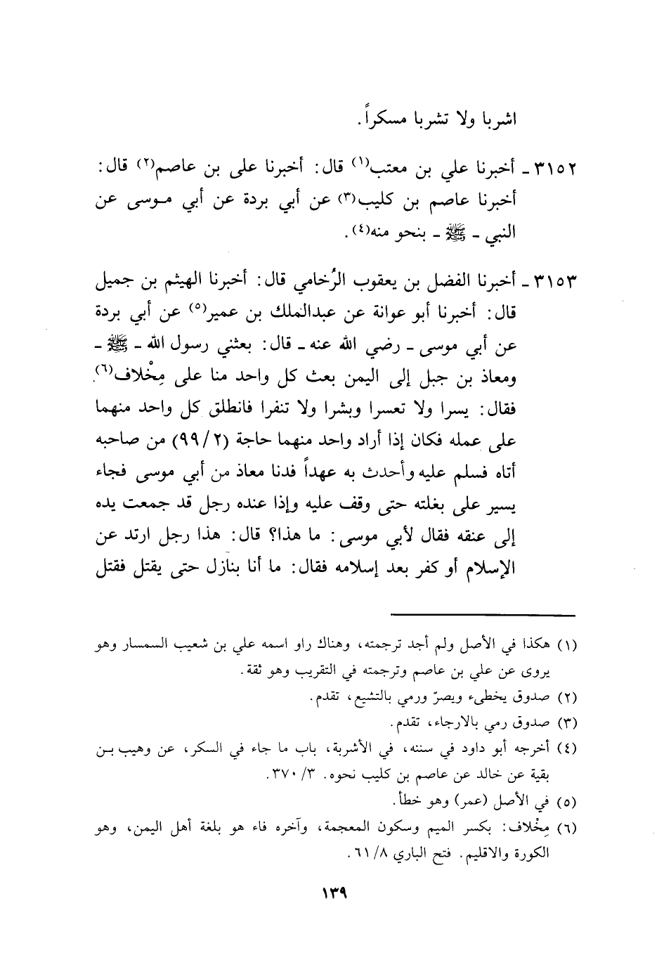 3153 - أَخْبَرَنَا الْفَضْلُ بْنُ يَعْقُوبَ الرُّخَامِيُّ، قَالَ: أَخْبَرَنَا الْهَيْثَمُ بْنُ جَمِيلٍ، قَالَ: أَخْبَرَنَا أَبُو عَوَانَةَ، عَنْ عَبْدِ الْمَلِكِ بْنِ عُمَيْرٍ، عَنْ أَبِي بُرْدَةَ، عَنْ أَبِي مُوسَى، رَضِيَ اللَّهُ عَنْهُ قَالَ: بَعَثَنِي رَسُولُ اللَّهِ صَلَّى اللهُ عَلَيْهِ وَسَلَّمَ وَمُعَاذُ بْنُ جَبَلٍ إِلَى الْيَمَنِ، بَعَثَ كُلَّ وَاحِدٍ مِنَّا عَلَى مِخْلَافٍ، فَقَالَ: «§يَسِّرَا وَلَا تُعَسِّرَا، وَبَشِّرَا وَلَا تُنَفِّرَا» ، فَانْطَلَقَ كُلُّ وَاحِدٍ مِنْهُمَا عَلَى عَمَلِهِ، فَكَانَ إِذَا أَرَادَ وَاحِدٌ مِنْهُمَا حَاجَةً مِنْ صَاحِبِهِ، أَتَاهُ فَسَلَّمَ عَلَيْهِ وَأَحْدَثَ بِهِ عَهْدًا، فَدَنَا مُعَاذٌ مِنْ أَبِي مُوسَى، فَجَاءَ يَسِيرُ عَلَى بَغْلَتِهِ حَتَّى وَقَفَ عَلَيْهِ، وَإِذَا عِنْدَهُ رَجُلٌ قَدْ جُمِعَتْ يَدُهُ إِلَى عُنُقِهِ، فَقَالَ لِأَبِي مُوسَى: مَا هَذَا؟، قَالَ: هَذَا رَجُلٌ ارْتَدَّ عَنِ الْإِسْلَامِ أَوْ كَفَرَ بَعْدَ إِسْلَامِهِ، فَقَالَ مَا أَنَا بِنَازِلٍ حَتَّى يُقْتَلَ، فَقُتِلَ -[140]- ثُمَّ نَزَلَ