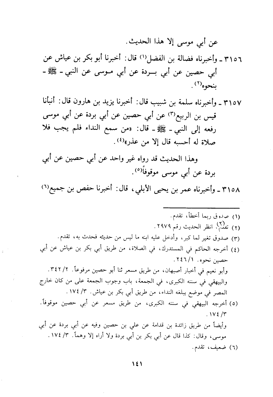 3157 - وَأَخْبَرَنَاهُ سَلَمَةُ بْنُ شَبِيبٍ، قَالَ: أَخْبَرَنَا يَزِيدُ بْنُ هَارُونَ، قَالَ: أَنْبَأَنَا قَيْسُ بْنُ الرَّبِيعِ، عَنْ أَبِي حُصَيْنٍ، عَنْ أَبِي بُرْدَةَ، عَنْ أَبِي مُوسَى، رَفَعَهُ إِلَى النَّبِيِّ صَلَّى اللهُ عَلَيْهِ وَسَلَّمَ قَالَ: «§مَنْ سَمِعَ النِّدَاءَ فَلَمْ يُجِبْ، فَلَا صَلَاةَ لَهُ» ، أَحْسِبُهُ قَالَ: إِلَّا مِنْ عُذْرٍ "، هَذَا الْحَدِيثُ قَدْ رَوَاهُ غَيْرُ وَاحِدٍ عَنْ أَبِي حُصَيْنٍ عَنْ أَبِي بُرْدَةَ عَنْ أَبِي مُوسَى مَوْقُوفًا