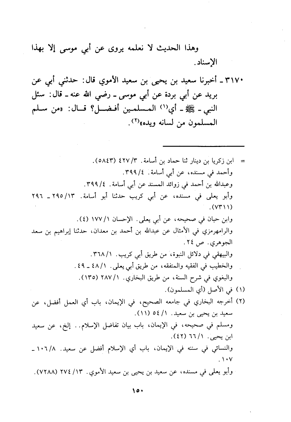 3170 - أَخْبَرَنَا سَعِيدُ بْنُ يَحْيَى بْنِ سَعِيدٍ الْأُمَوِيُّ، قَالَ: حَدَّثَنِي أَبِي، عَنْ بُرَيْدٍ، عَنْ أَبِي بُرْدَةَ، عَنْ أَبِي مُوسَى رَضِيَ اللَّهُ عَنْهُ قَالَ سُئِلَ النَّبِيُّ صَلَّى اللهُ عَلَيْهِ وَسَلَّمَ: أَيُّ الْمُسْلِمِينَ أَفْضَلُ؟، قَالَ: «§مَنْ سَلِمَ الْمُسْلِمُونَ مِنْ لِسَانِهِ وَيَدِهِ» -[151]-،