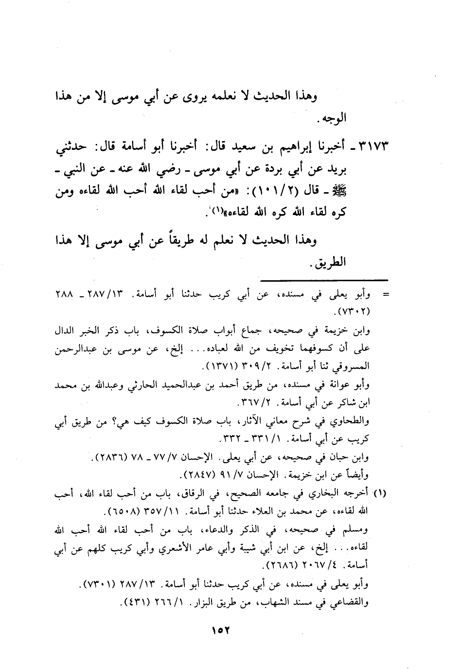 3173 - أَخْبَرَنَا إِبْرَاهِيمُ بْنُ سَعِيدٍ، قَالَ: أَخْبَرَنَا أَبُو أُسَامَةَ، قَالَ: حَدَّثَنِي بُرَيْدٌ، عَنْ أَبِي بُرْدَةَ، عَنْ أَبِي مُوسَى، رَضِيَ اللَّهُ عَنْهُ عَنِ النَّبِيِّ صَلَّى اللهُ عَلَيْهِ وَسَلَّمَ قَالَ: «§مَنْ أَحَبَّ لِقَاءَ اللَّهِ أَحَبَّ اللَّهُ لِقَاءَهُ، وَمَنْ كَرِهَ لِقَاءَ اللَّهِ كَرِهَ اللَّهُ لِقَاءَهُ» ، وَهَذَا الْحَدِيثُ لَا نَعْلَمُ لَهُ طَرِيقًا عَنْ أَبِي مُوسَى إِلَّا هَذَا الطَّرِيقَ