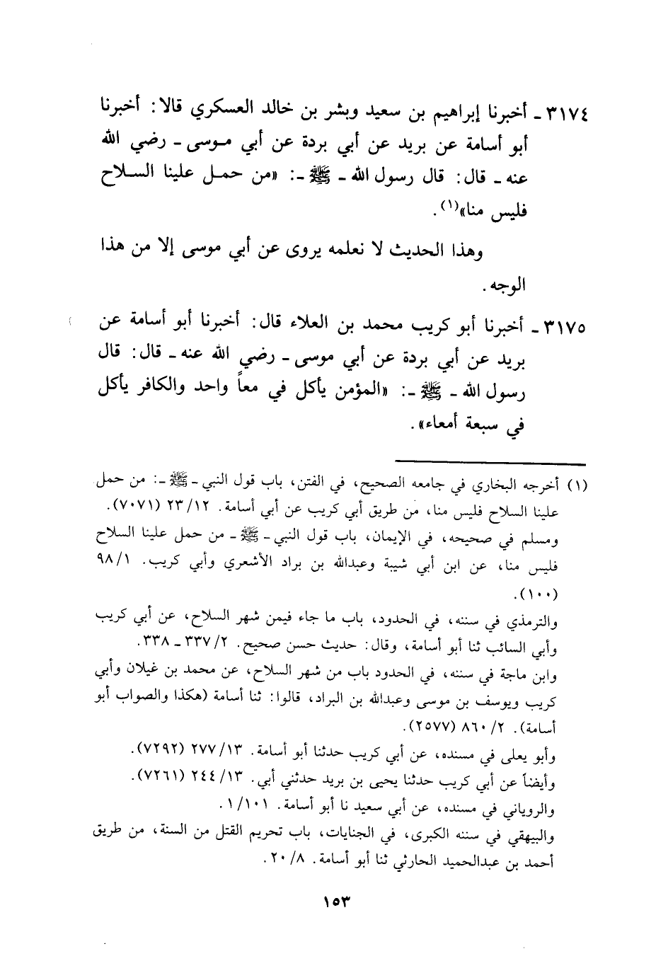 3174 - أَخْبَرَنَا إِبْرَاهِيمُ بْنُ سَعِيدٍ، وَبِشْرُ بْنُ خَالِدٍ الْعَسْكَرِيُّ، قَالَا: أَخْبَرَنَا أَبُو أُسَامَةَ، عَنْ بُرَيْدٍ، عَنْ أَبِي بُرْدَةَ، عَنْ أَبِي مُوسَى، رَضِيَ اللَّهُ عَنْهُ قَالَ: قَالَ رَسُولُ اللَّهِ صَلَّى اللهُ عَلَيْهِ وَسَلَّمَ: «§مَنْ حَمَلَ عَلَيْنَا السِّلَاحَ فَلَيْسَ مِنَّا» ، وَهَذَا الْحَدِيثُ لَا نَعْلَمُهُ يُرْوَى عَنْ أَبِي مُوسَى إِلَّا مِنْ هَذَا الْوَجْهِ