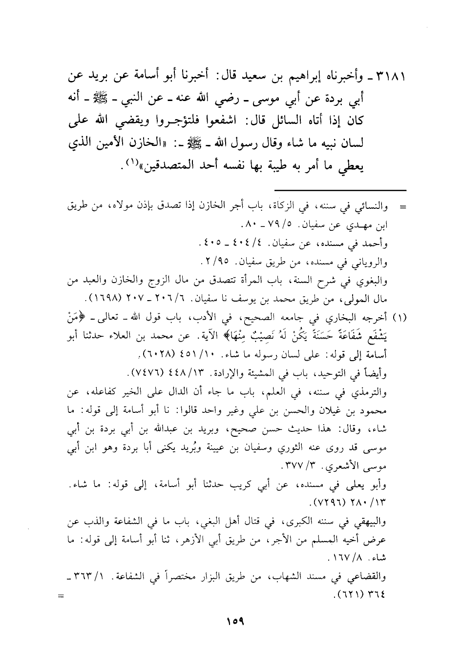 3181 - وَأَخْبَرَنَاهُ إِبْرَاهِيمُ بْنُ سَعِيدٍ، قَالَ: أَخْبَرَنَا أَبُو أُسَامَةَ، عَنْ بُرَيْدٍ، عَنْ أَبِي بُرْدَةَ، عَنْ أَبِي مُوسَى، رَضِيَ اللَّهُ عَنْهُ عَنِ النَّبِيِّ صَلَّى اللهُ عَلَيْهِ وَسَلَّمَ أَنَّهُ كَانَ إِذَا أَتَاهُ السَّائِلُ قَالَ: «§اشْفَعُوا فَلْتُؤْجَرُوا، وَيَقْضِي اللَّهُ عَلَى لِسَانِ نَبِيِّهِ مَا شَاءَ» ، وَقَالَ رَسُولُ اللَّهِ صَلَّى اللهُ عَلَيْهِ وَسَلَّمَ: «الْخَازِنُ الْأَمِينُ الَّذِي يُعْطِي مَا أُمِرَ بِهِ طَيِّبَةً بِهَا نَفْسُهُ أَحَدُ الْمُتَصَدِّقِينَ» -[160]-، وَهَذَا الْحَدِيثُ لَا نَعْلَمُ يُرْوَى عَنْ أَبِي مُوسَى إِلَّا مِنْ حَدِيثِ بُرَيْدٍ عَنْ أَبِي بُرْدَةَ عَنْهُ