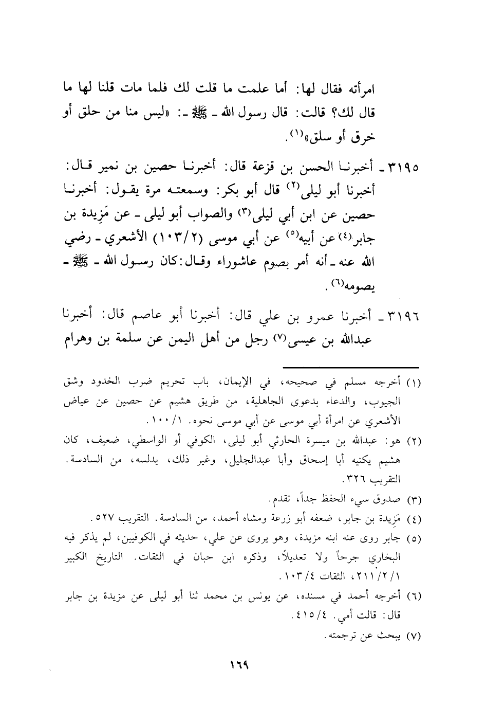 3195 - أَخْبَرَنَا الْحَسَنُ بْنُ قَزَعَةَ، قَالَ: أَخْبَرَنَا حُصَيْنُ بْنُ نُمَيْرٍ، قَالَ: أَخْبَرَنَا أَبُو لَيْلَى، قَالَ أَبُو بَكْرٍ: وَسَمِعْتُهُ مَرَّةً يَقُولُ: أَخْبَرَنَا حُصَيْنٌ، عَنِ ابْنِ أَبِي لَيْلَى وَالصَّوَابُ أَبُو لَيْلَى، عَنْ مَزْيَدَةَ بْنِ جَابِرٍ، عَنْ أَبِيهِ، عَنْ أَبِي مُوسَى الْأَشْعَرِيِّ رَضِيَ اللَّهُ عَنْهُ " أَنَّهُ أَمَرَ بِصَوْمِ عَاشُورَاءَ، وَقَالَ: «§كَانَ رَسُولُ اللَّهِ صَلَّى اللهُ عَلَيْهِ وَسَلَّمَ يَصُومُهُ»
